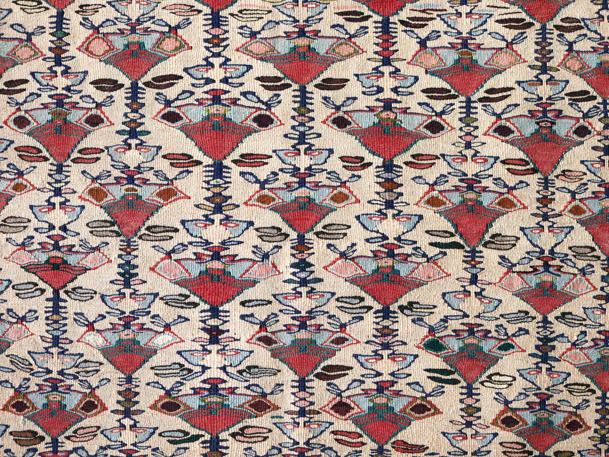 | アイボリーのベースに、花束のようなデザインが連なるように織られています。こちらは、イラン南西部、トルコとの国境に近いセネという町のキリムです。全面に隙間なく細かなモチーフが置かれているデザインはとても特徴的です。緻密で細かな織り、整ったモチーフ使いなど、交易品として織られたといわれる、セネ地方のキリムならではの特徴がよく出ています。 |