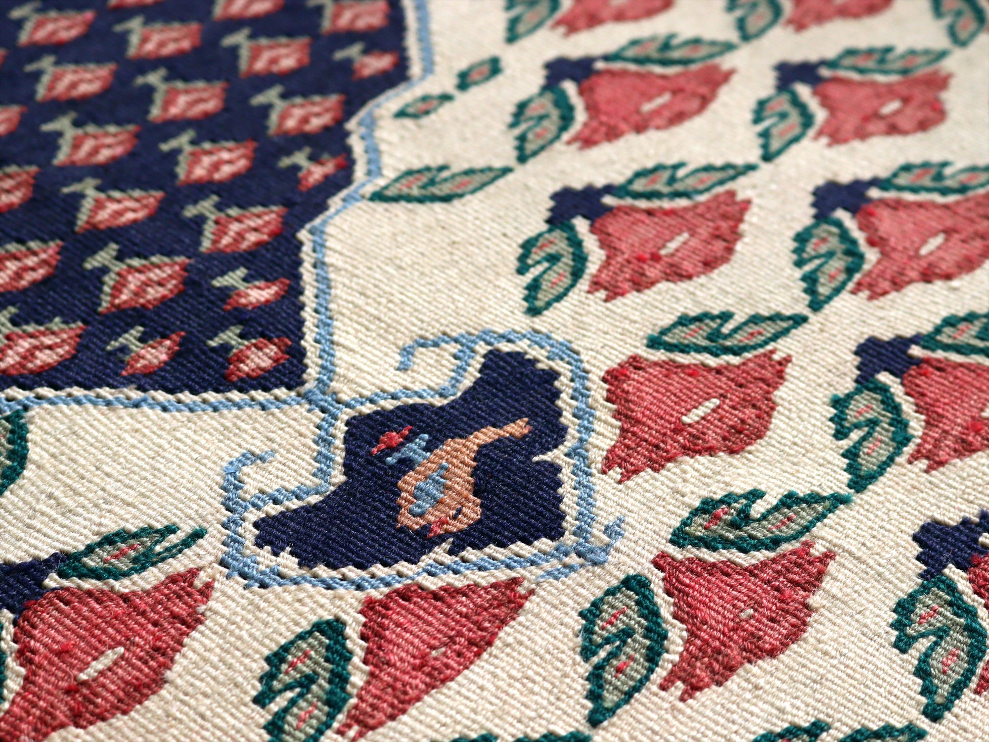 | 全体にに小さなピンクの花が並ぶ愛らしいモチーフ。イランの首都テヘランから、西に広がるビジャール地方の伝統柄です。メダリオンのかたちも特徴的です。 |
