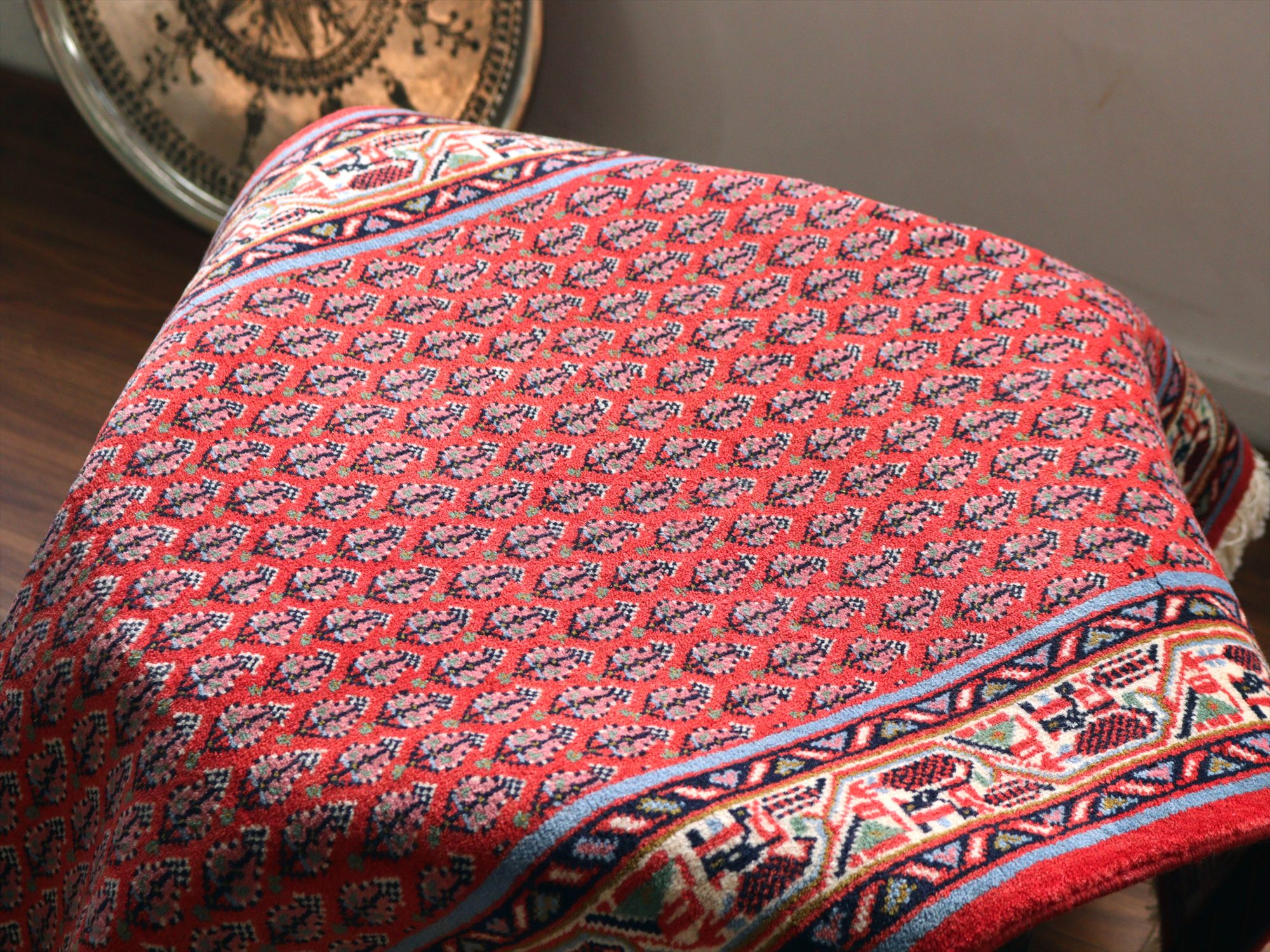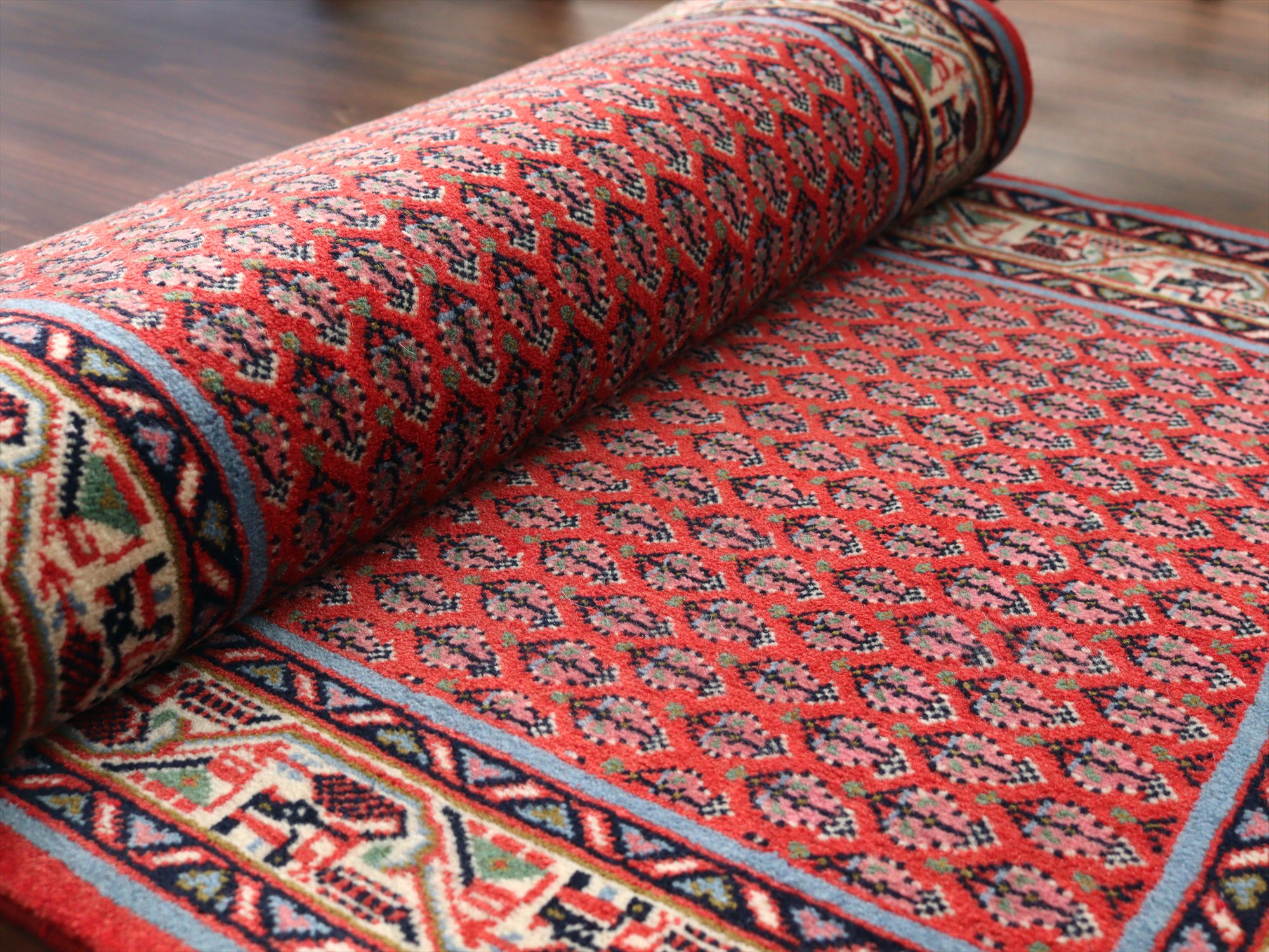| ボテと呼ばれるペイズリーのようなモチーフが一面に並ぶ伝統的なデザインのカーペットです。イラン西部・サルークエリアで織られたカーペットで、額縁は、ナチュラルアイボリーをベースに、ジグザグの流れる水を表現したモチーフが織りこまれています。 |