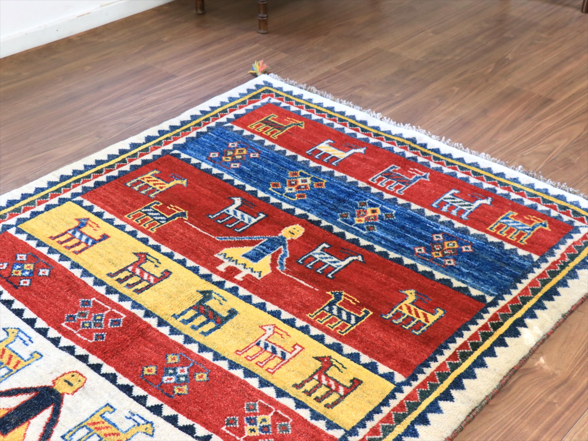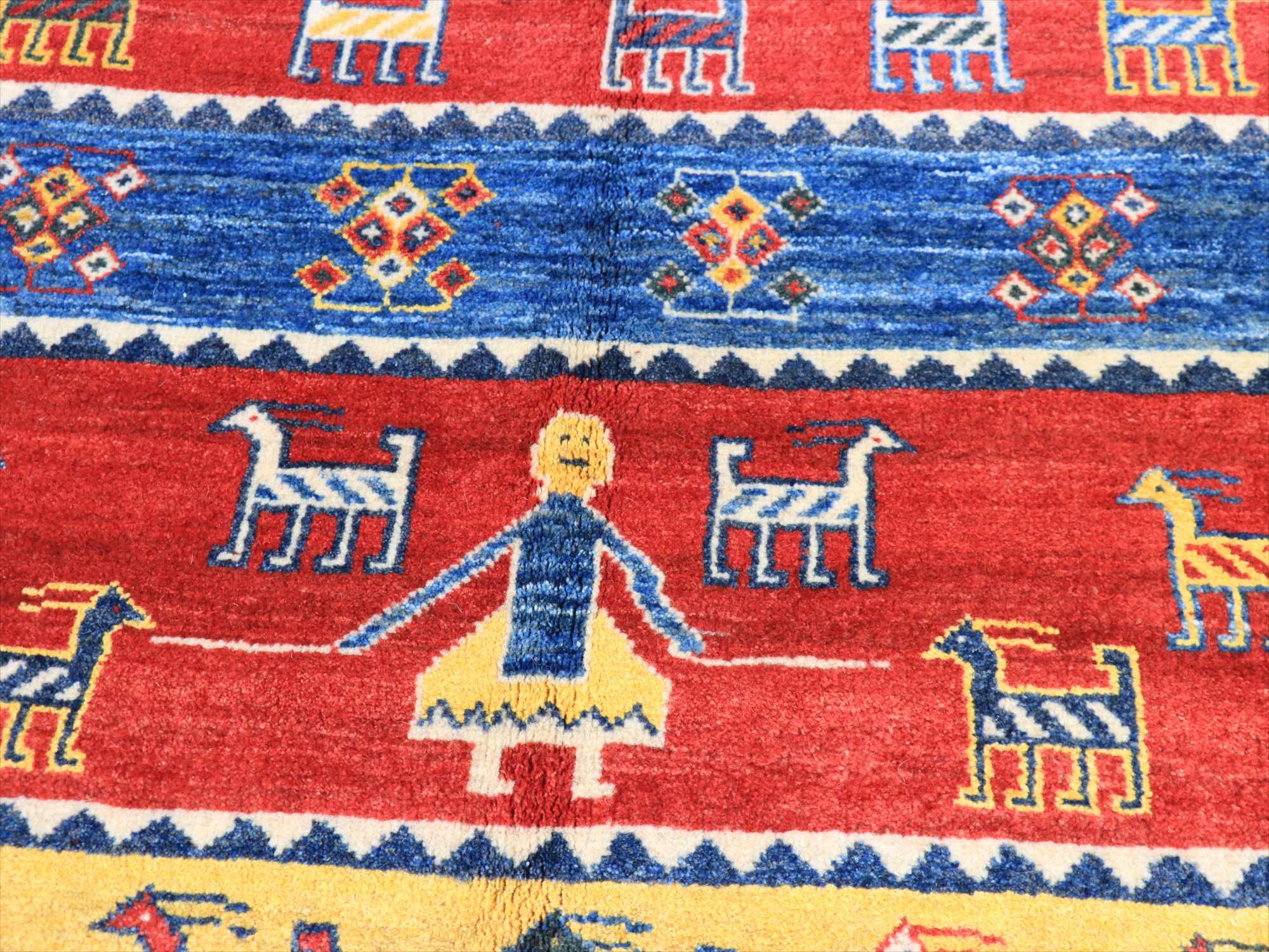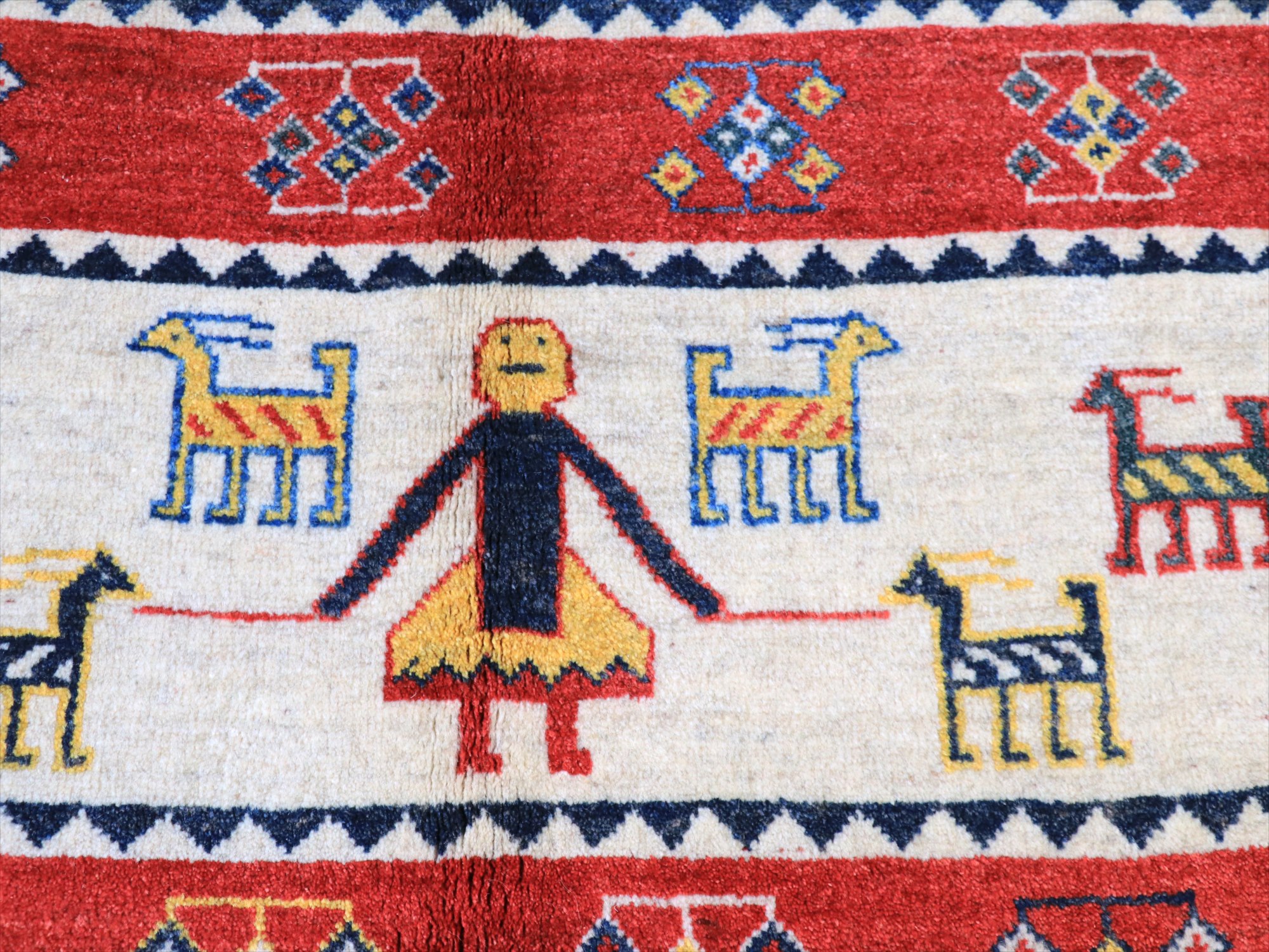 スカートをはいたカシュカイ族の女の子と羊の素朴なデザイン。新品未使用のギャッベで、10~15年ほど前に織られたものです。