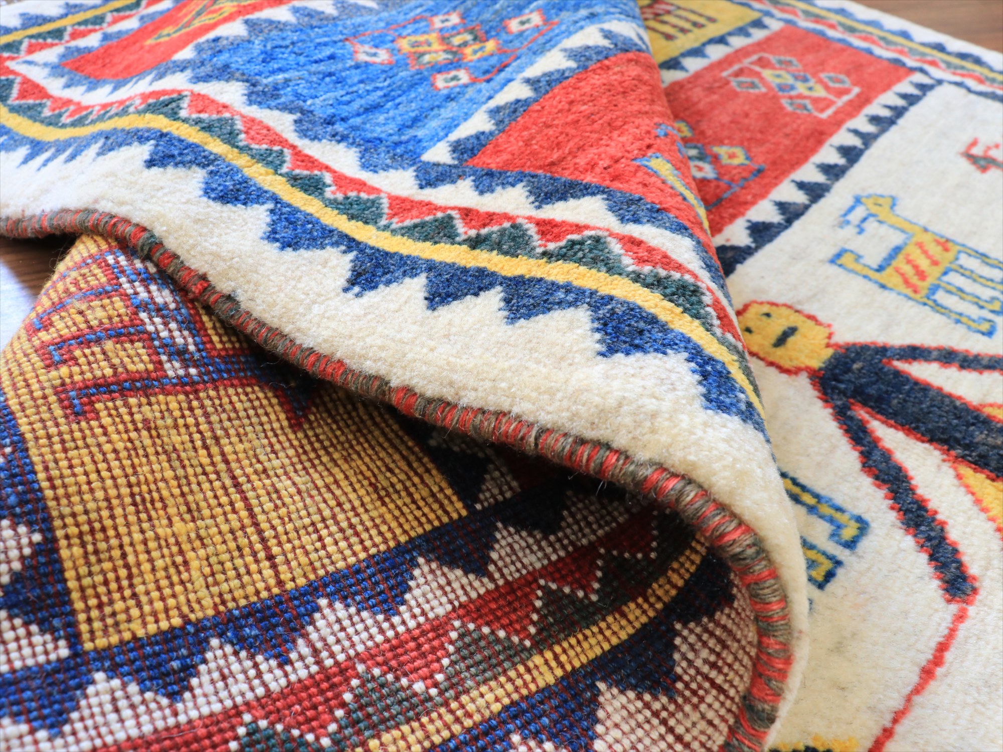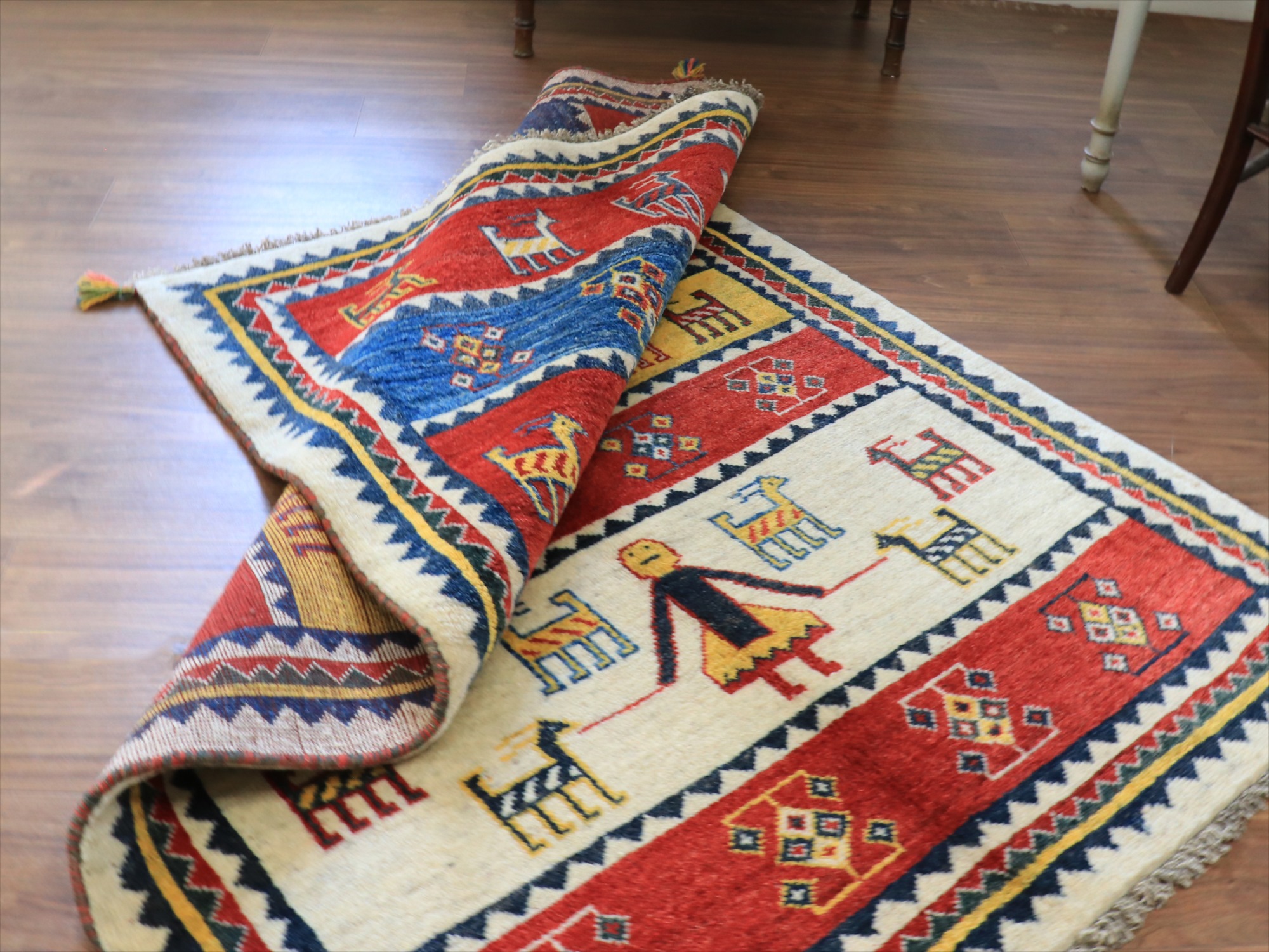 | 織り目の細かさは、中程度で10cmの間に30ノット前後のアマレバフと呼ばれるグループです。パイルを含めたギャッベの厚みは1.5cm前後。 |