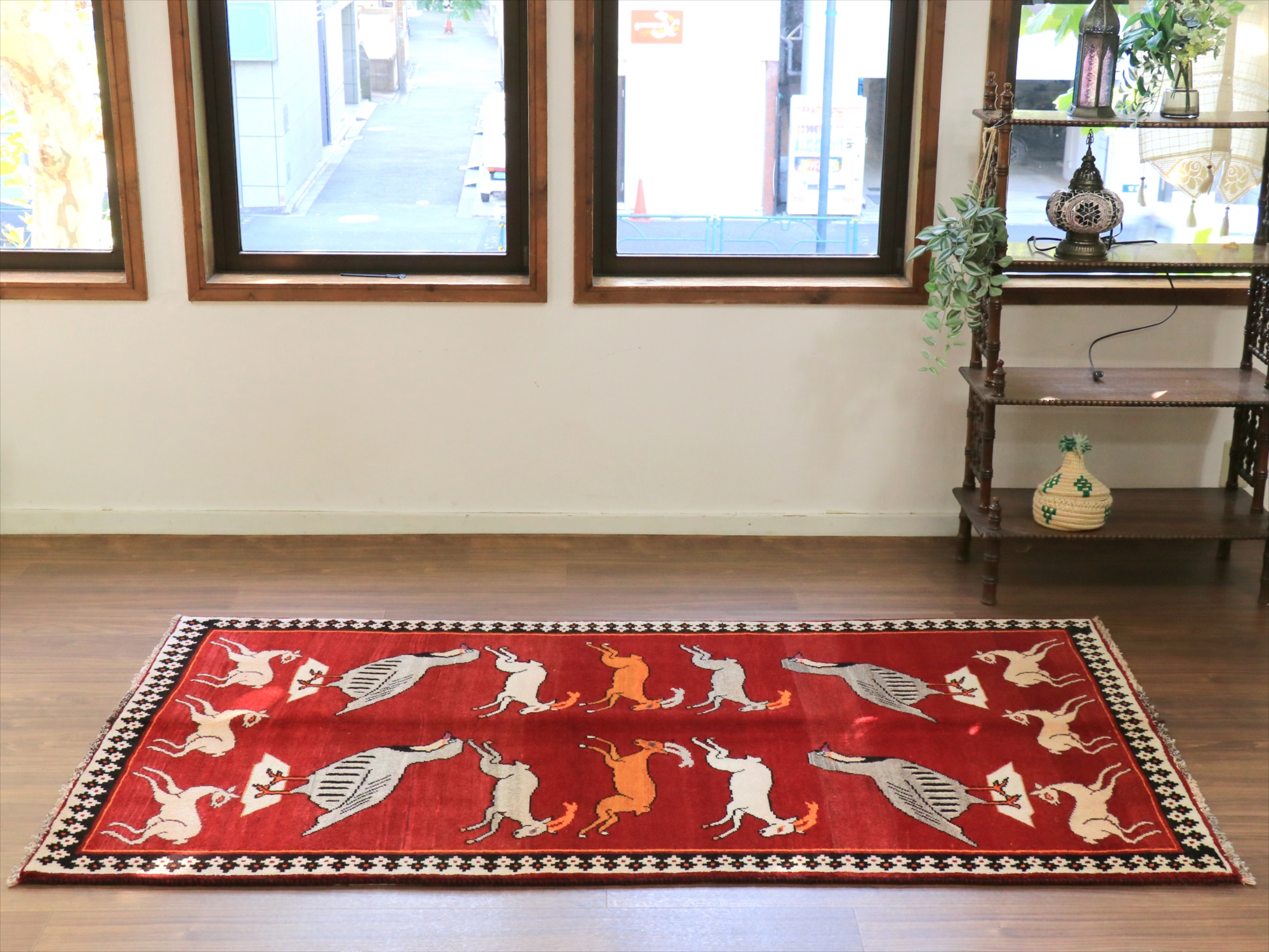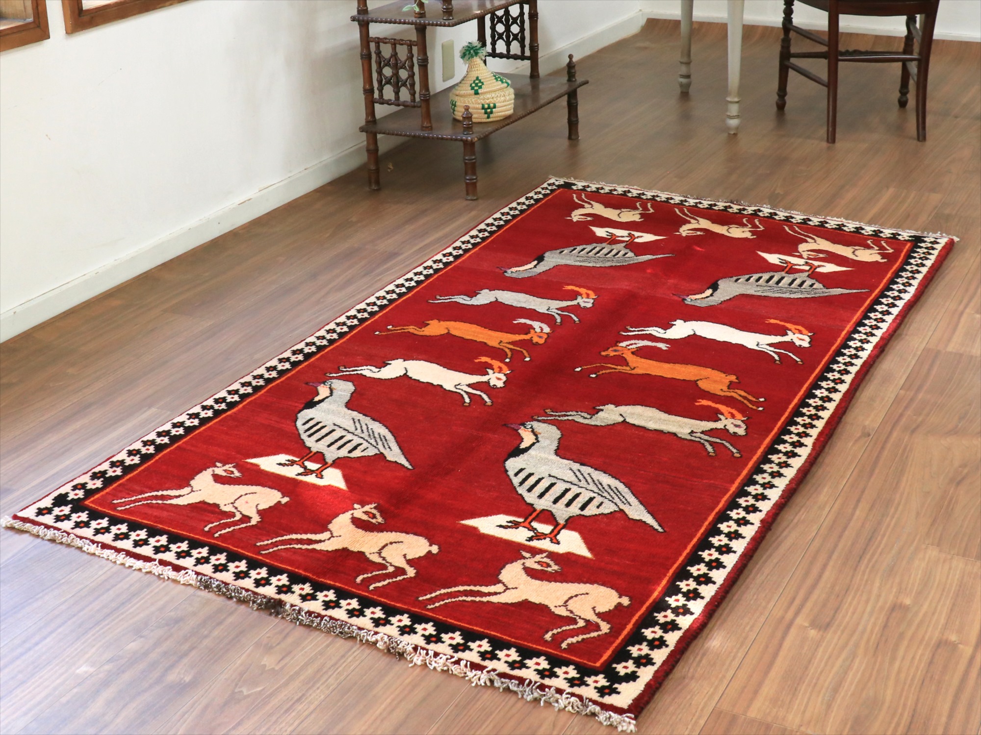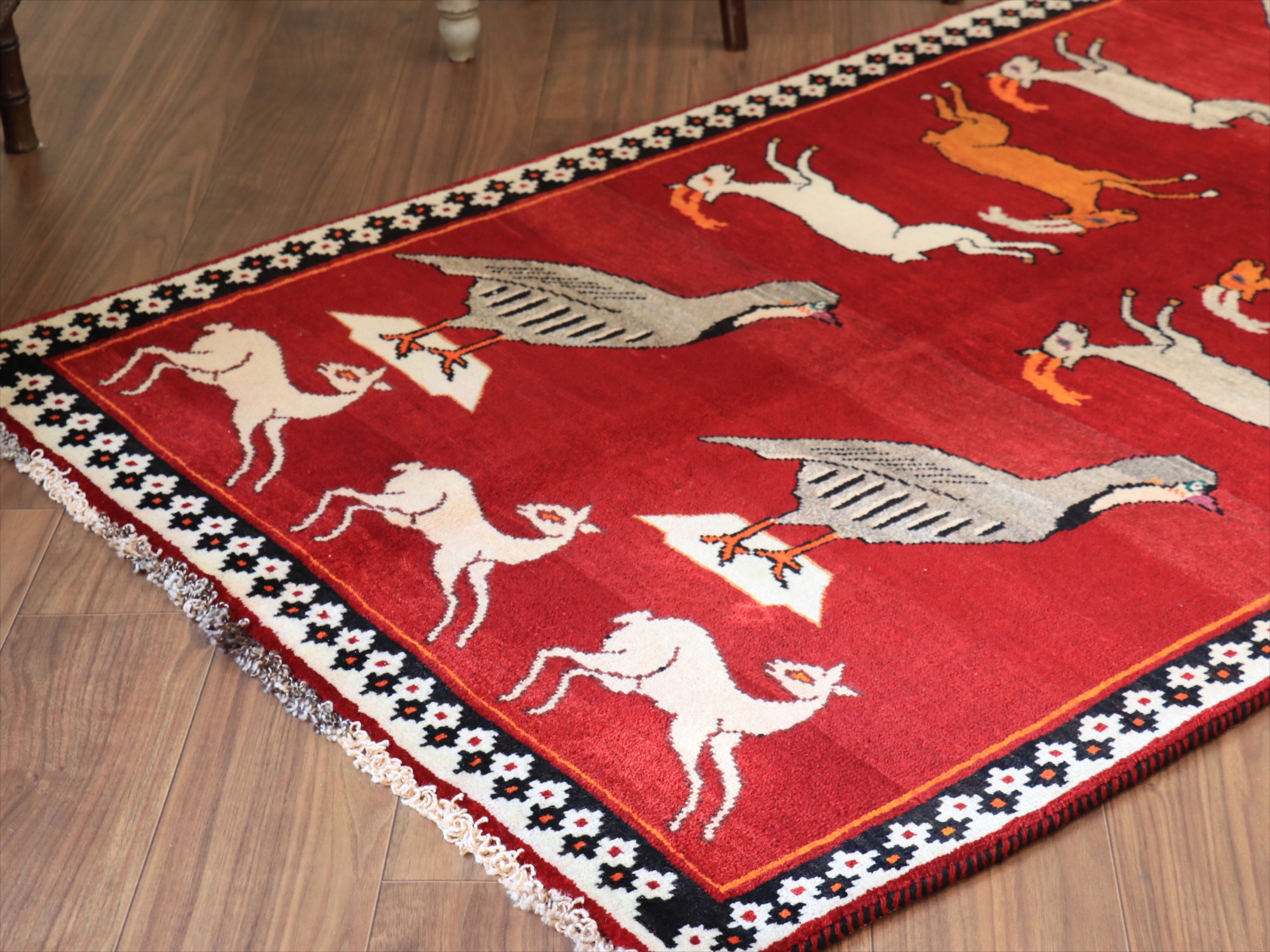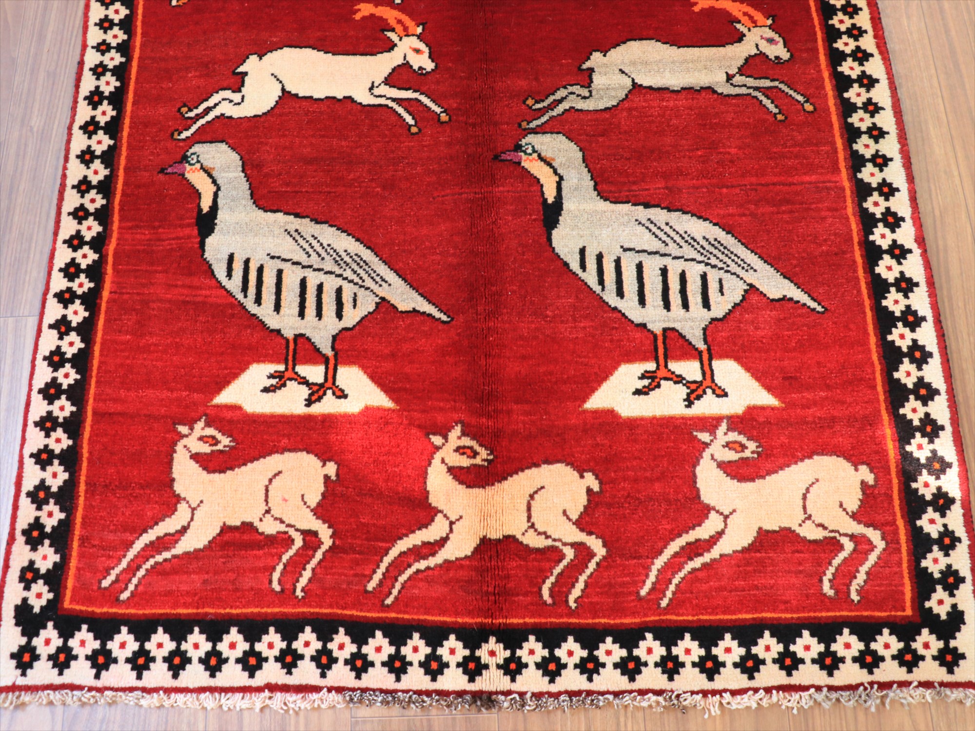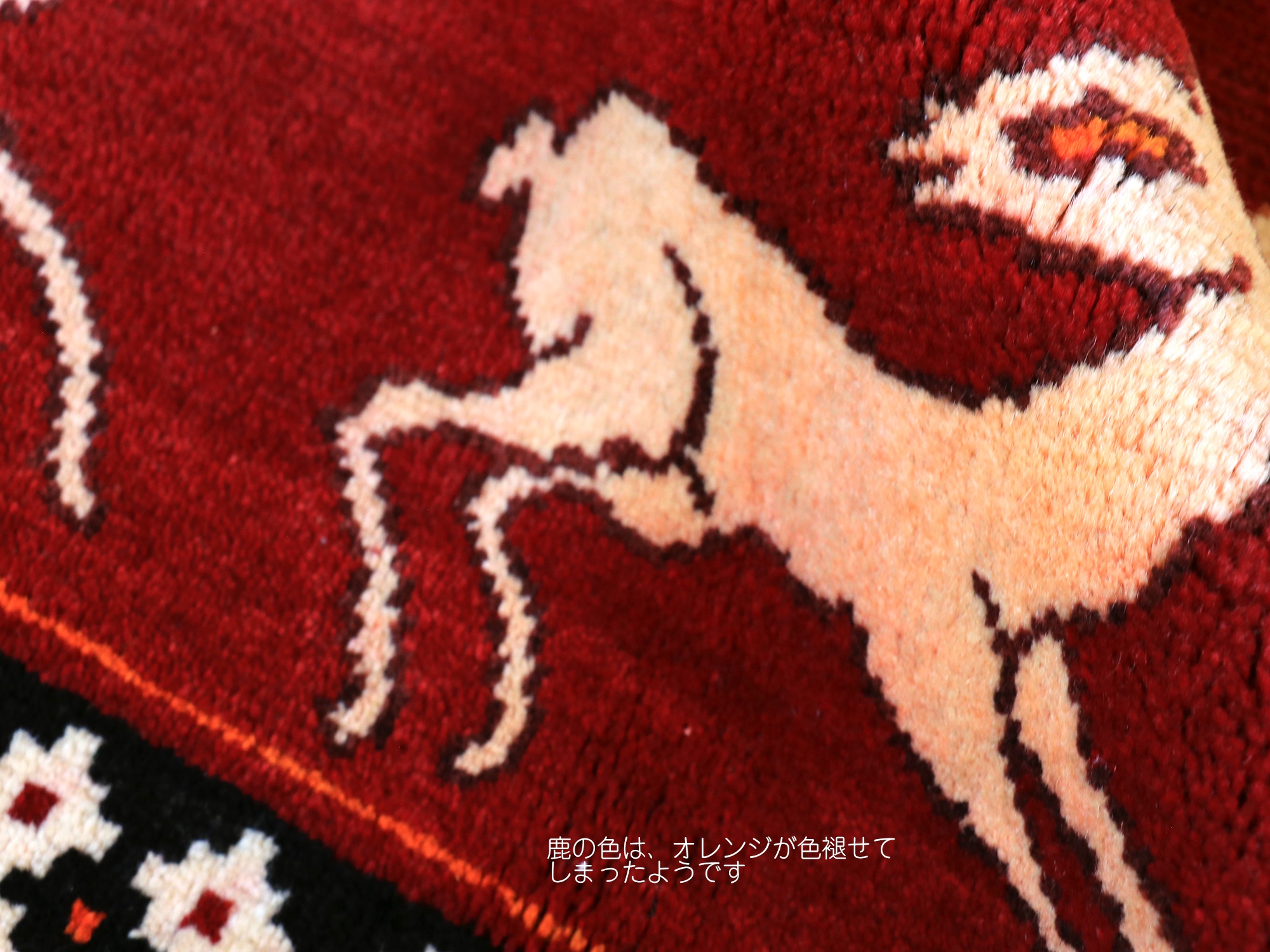 | 縦方向に配置されたレイアウトがユニーク。レッドをベースに、デザインの異なる鹿と鳥がたくさんならんでいます。鹿は家畜ではありませんが、森の中から親子仲良く現れる鹿は、家庭円満の象徴とも言われ、カシュカイ族のラグにはたびたび登場するモチーフです。 |