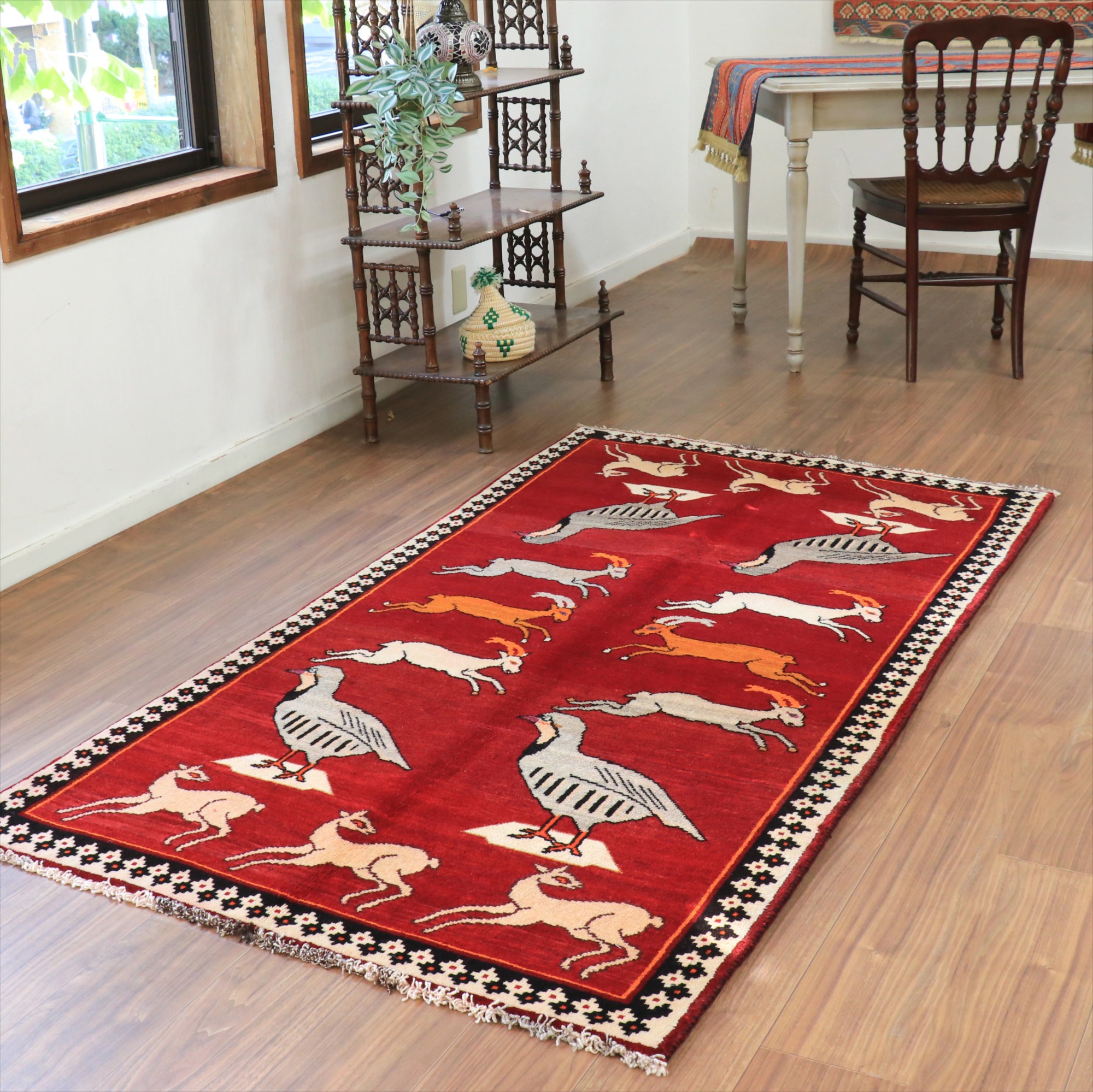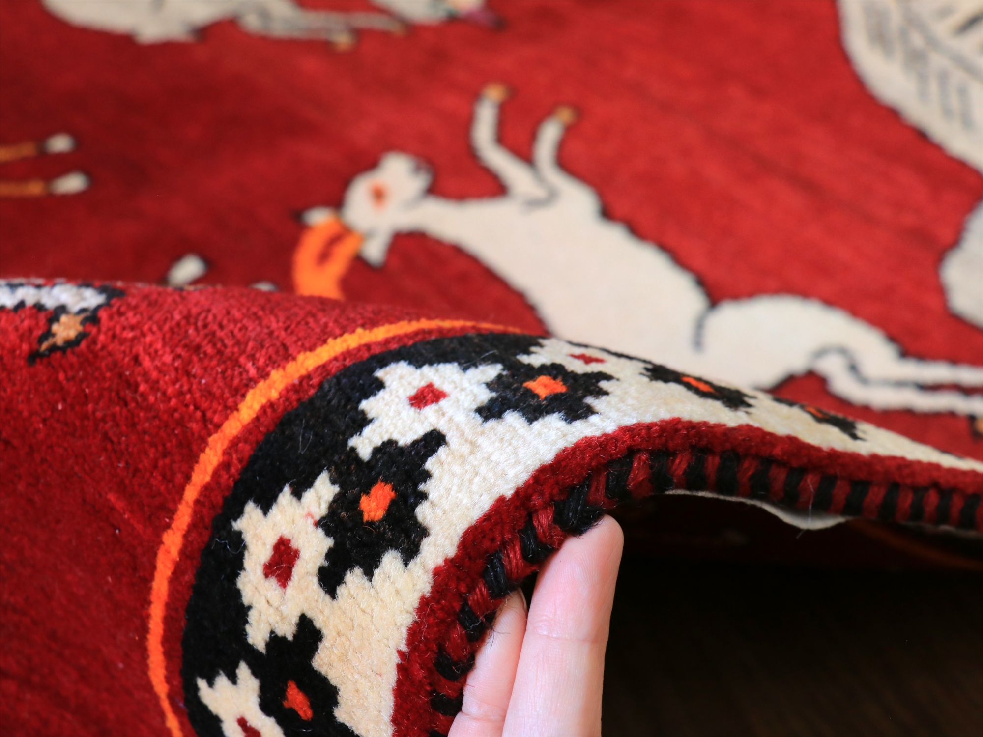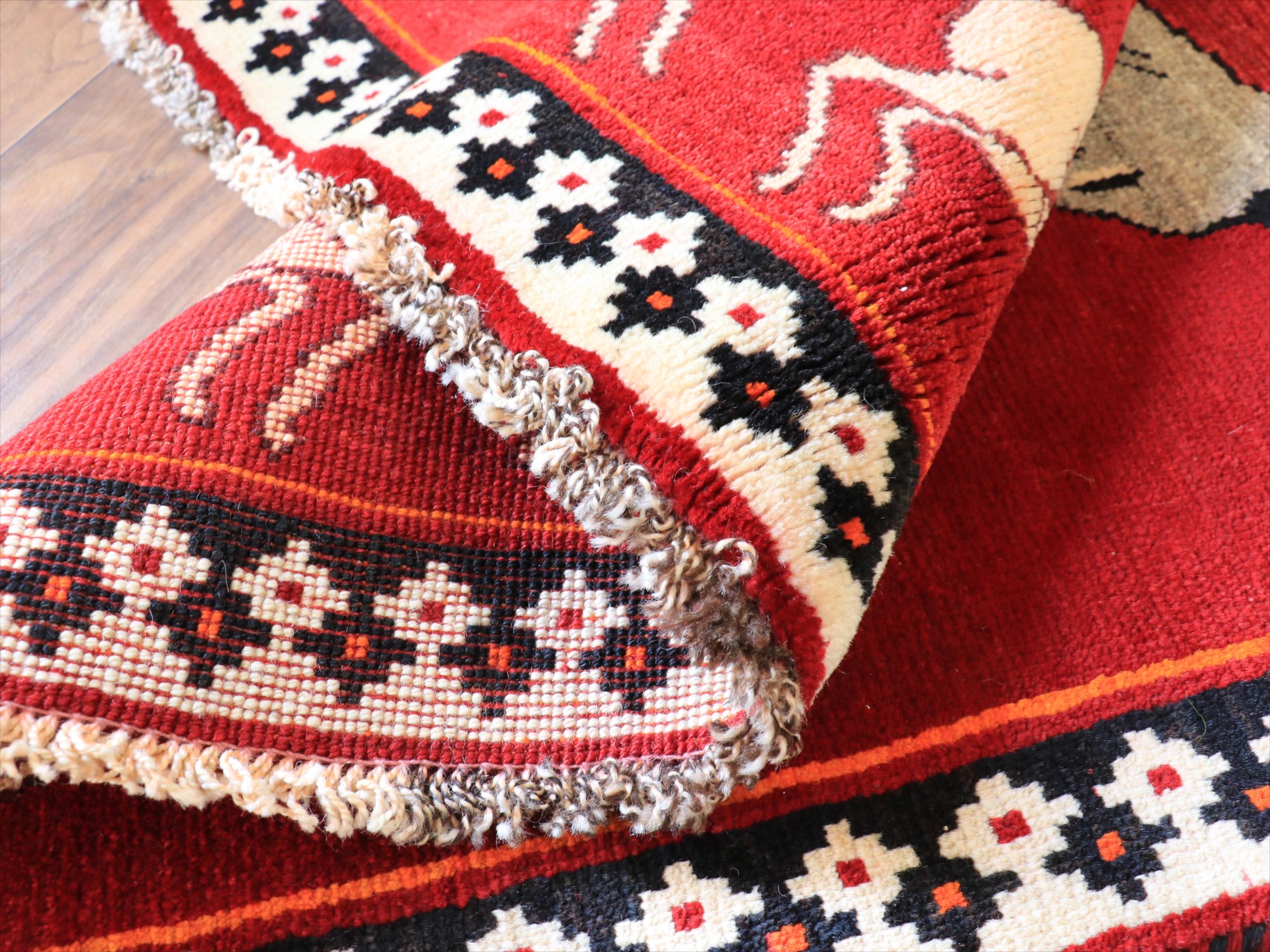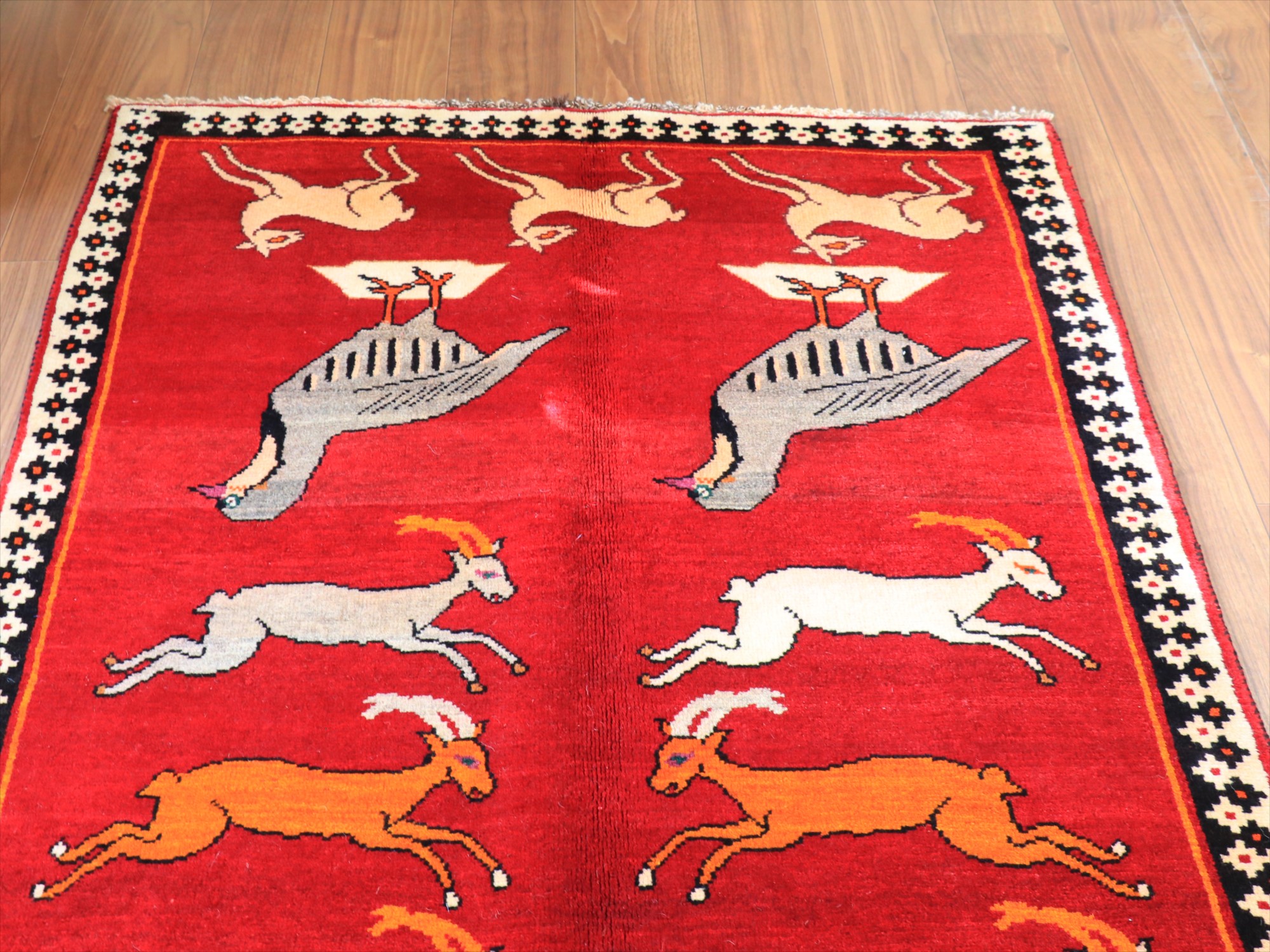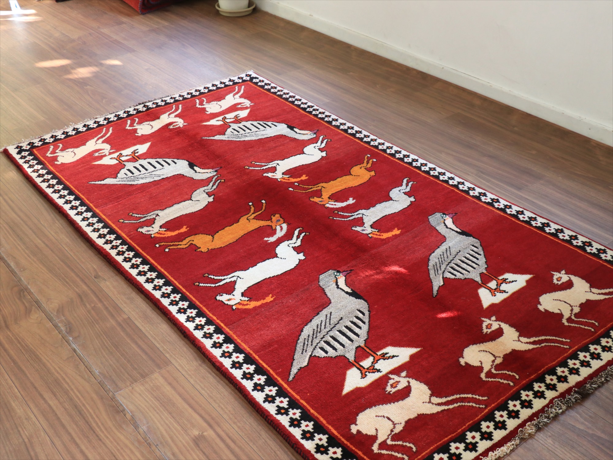 | 縦方向に配置されたレイアウトがユニーク。レッドをベースに、デザインの異なる鹿と鳥がたくさんならんでいます。鹿は家畜ではありませんが、森の中から親子仲良く現れる鹿は、家庭円満の象徴とも言われ、カシュカイ族のラグにはたびたび登場するモチーフです。 |