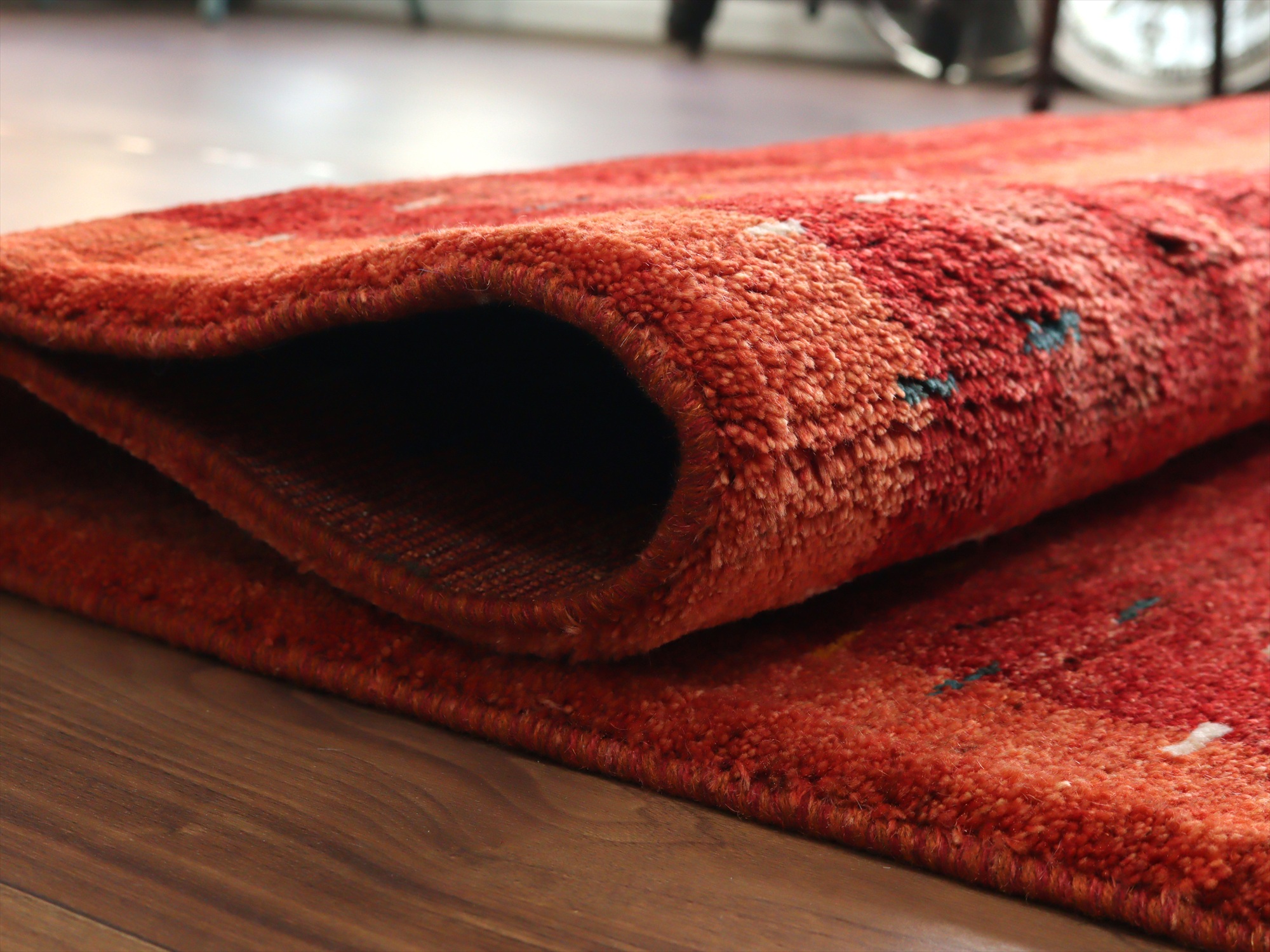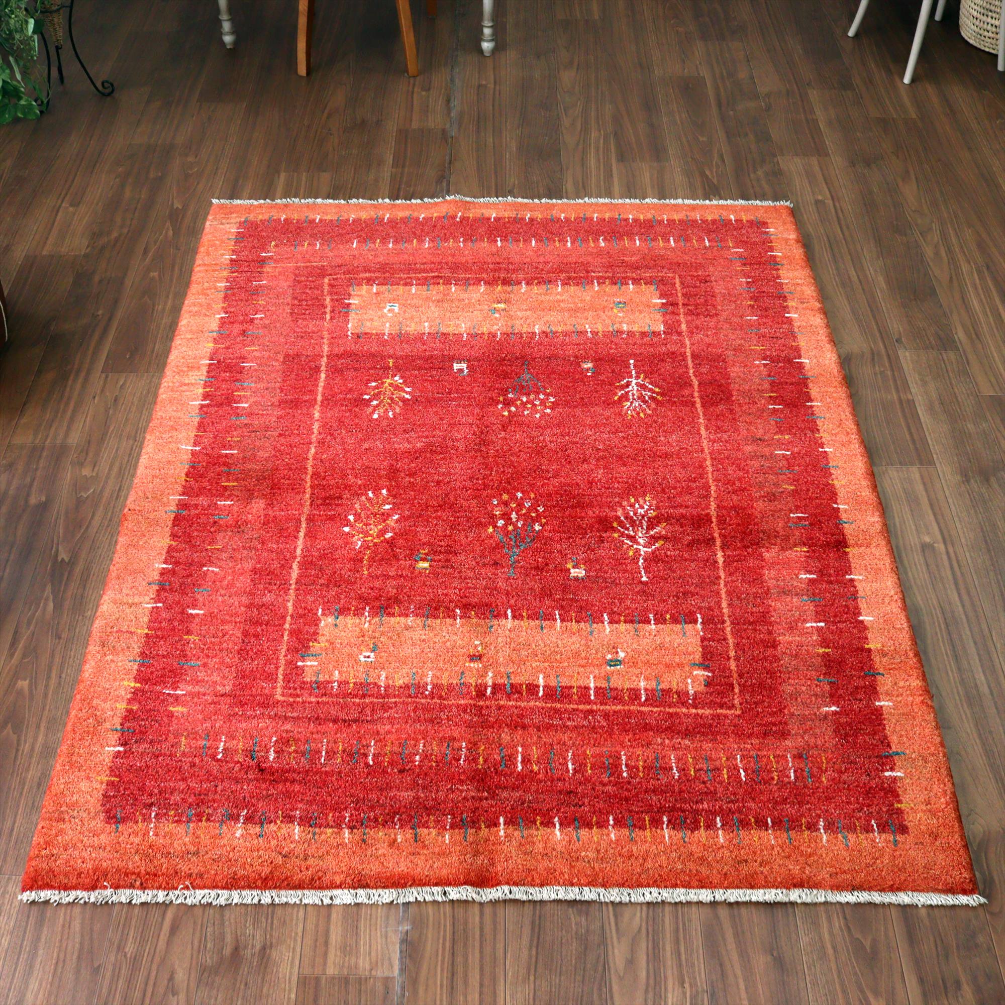| 濃淡のあるレッドの色合いを活かして織られたギャッベ。樹々や羊たちが織られ、遊牧民の生活の風景を思い起こさせるような素朴な雰囲気の1枚です。 |