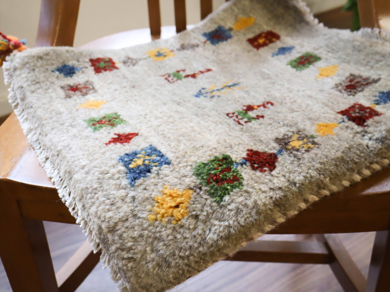 - ギャッベ イラン産手織り 座布団サイズ 42x40cm ライトグレー カラフルなモチーフ