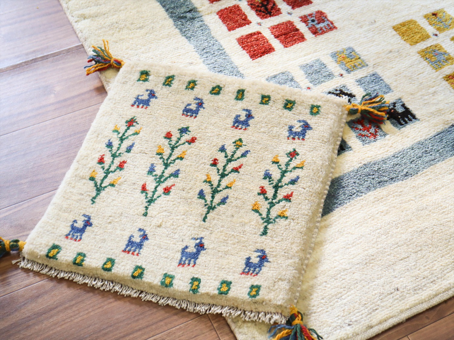 - ギャッベ イラン産手織り 座布団サイズ 42x41cm ナチュラルアイボリー
