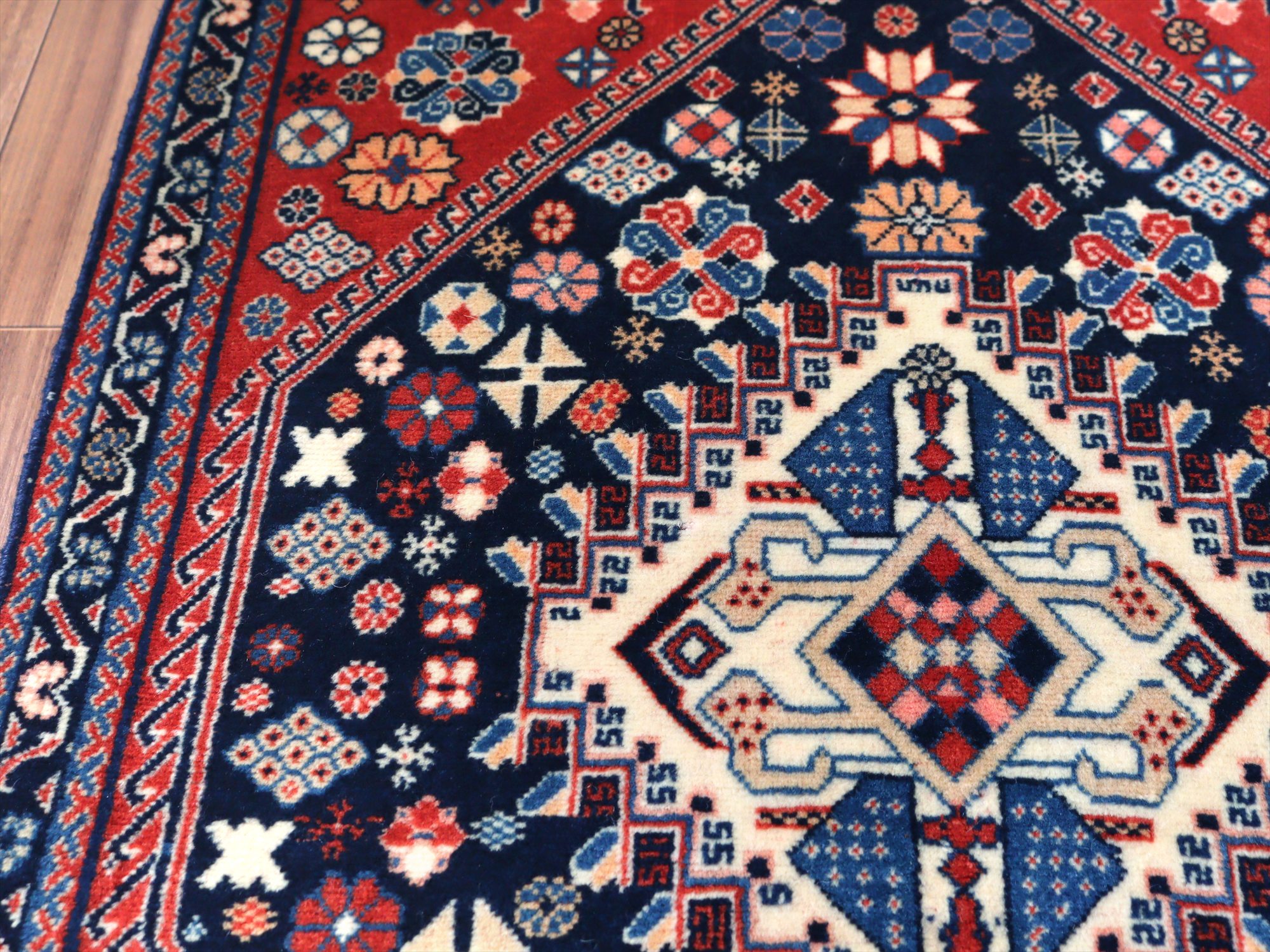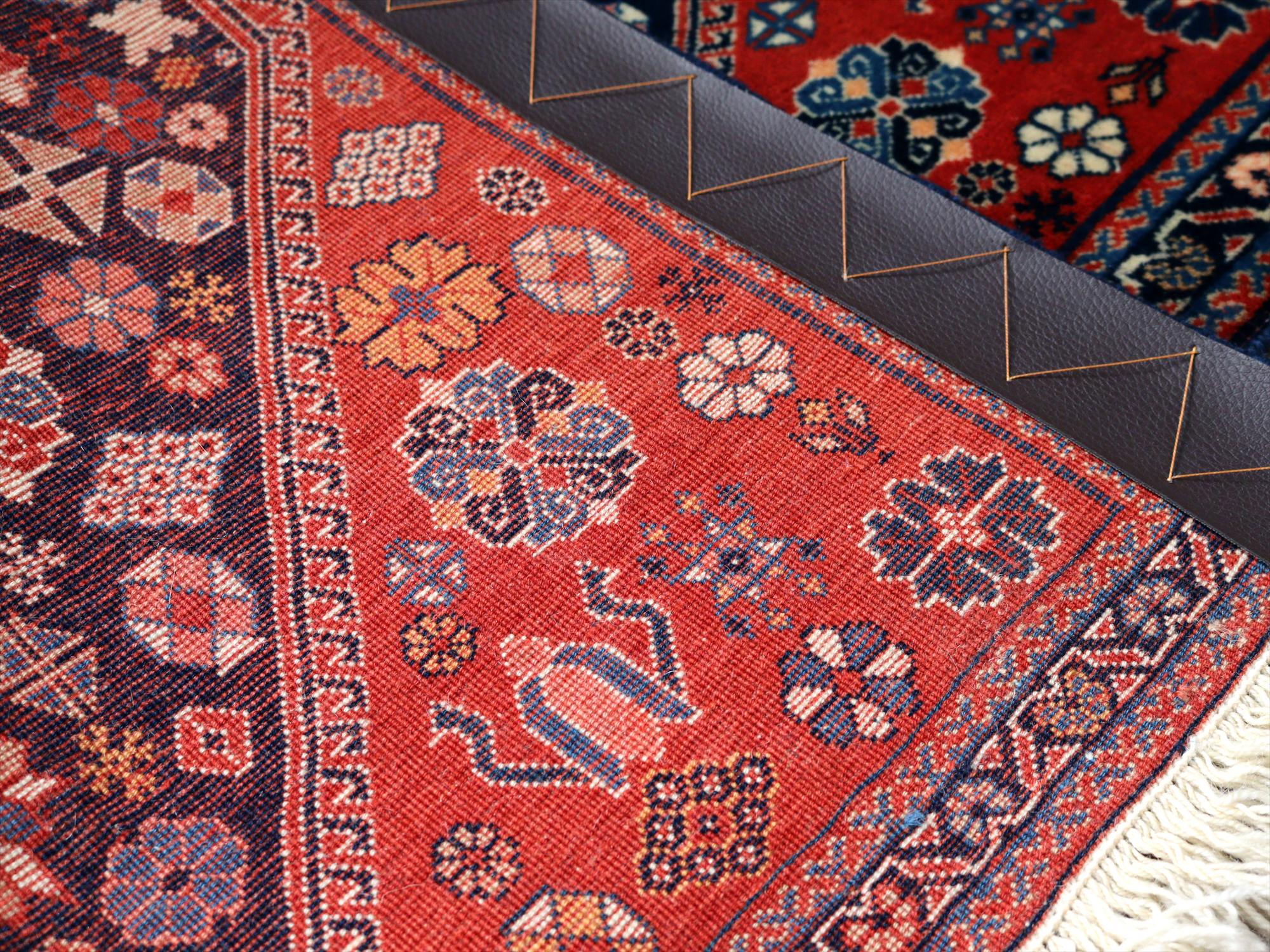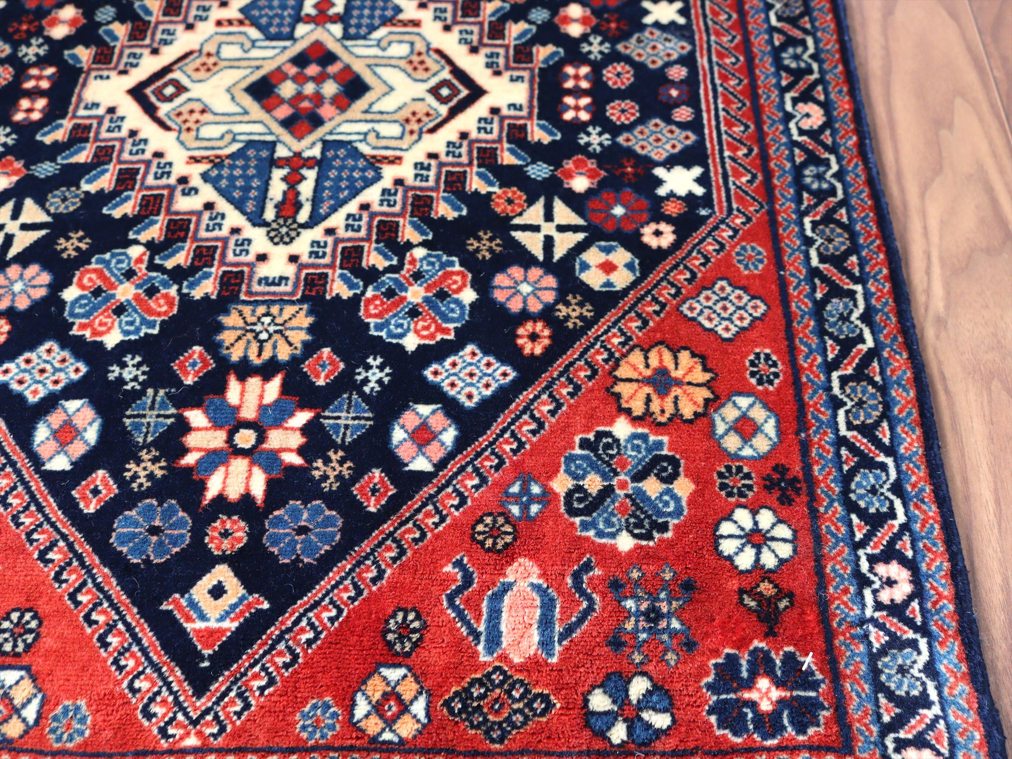 | 朱色と濃紺をメインとした色使いで六角のメダリオンが織られた絨毯。小花や幾何学モチーフも全体に規則正しく散りばめられていて、整った印象です。レッド、ネイビーの部分は特に草木染の色合いがよく出ているのも確認でき、それだけでも素敵な1枚です。 |