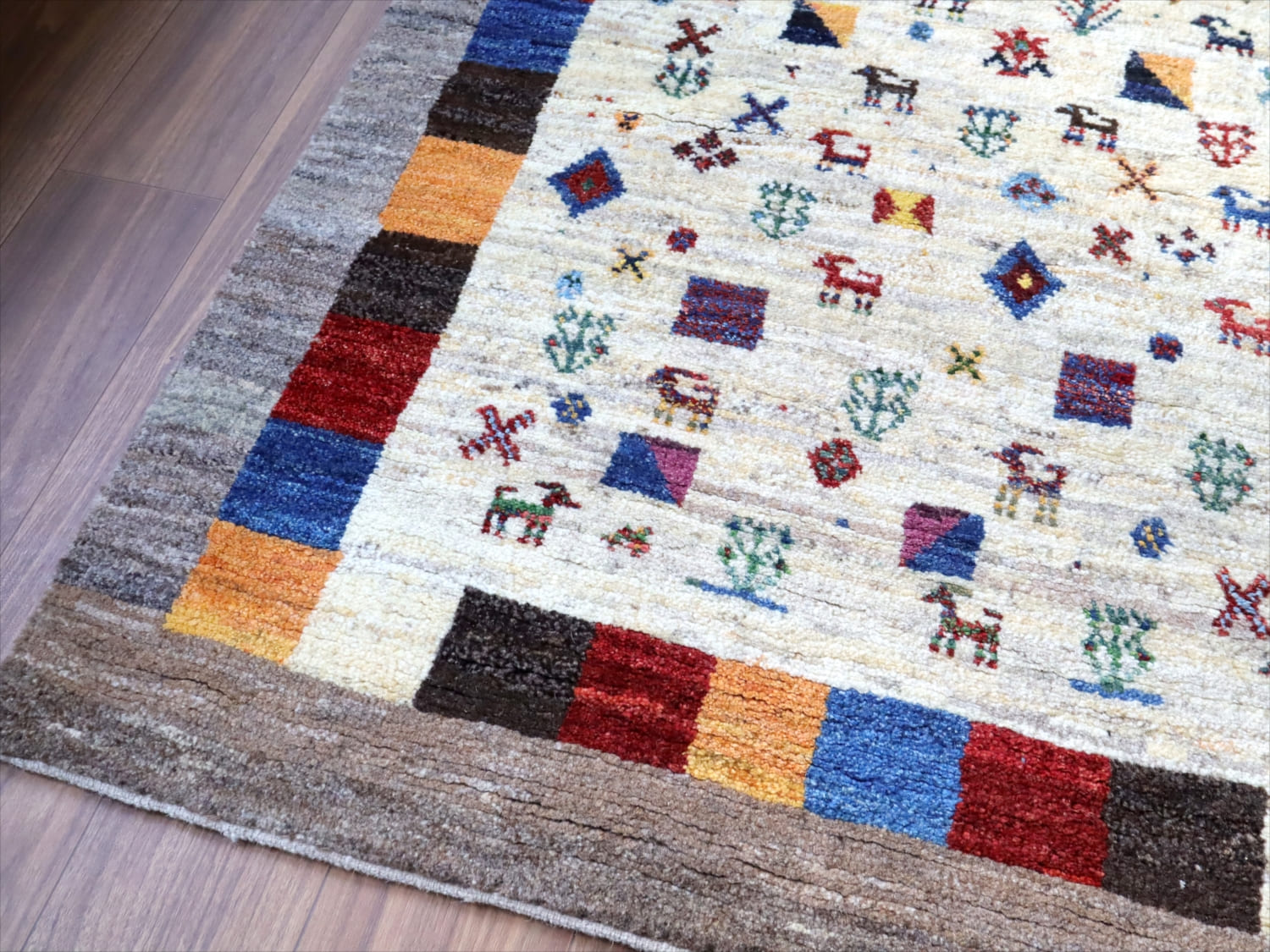 ギャッベ ノマド 156x107cm ナチュラル&グレー たくさんの動物や草花モチーフ イラン産手織り Gabbeh Nomad