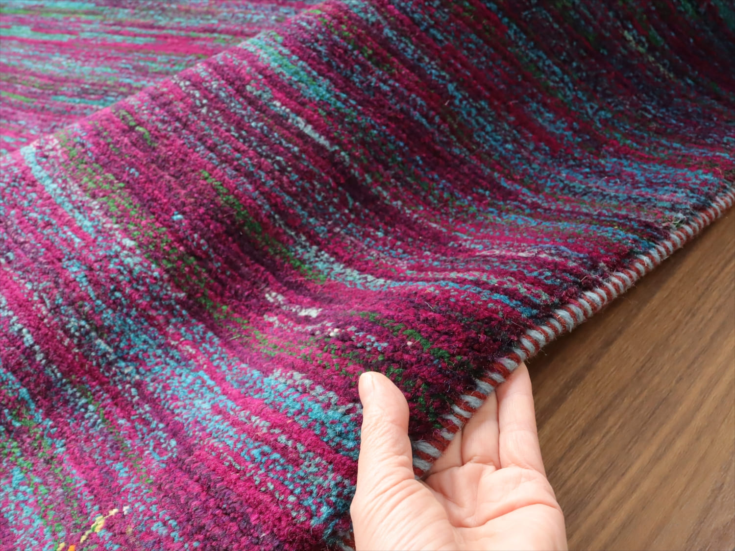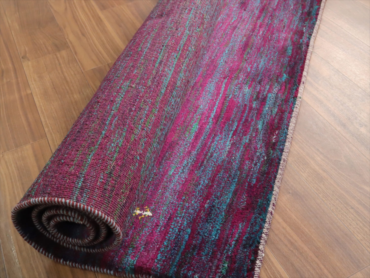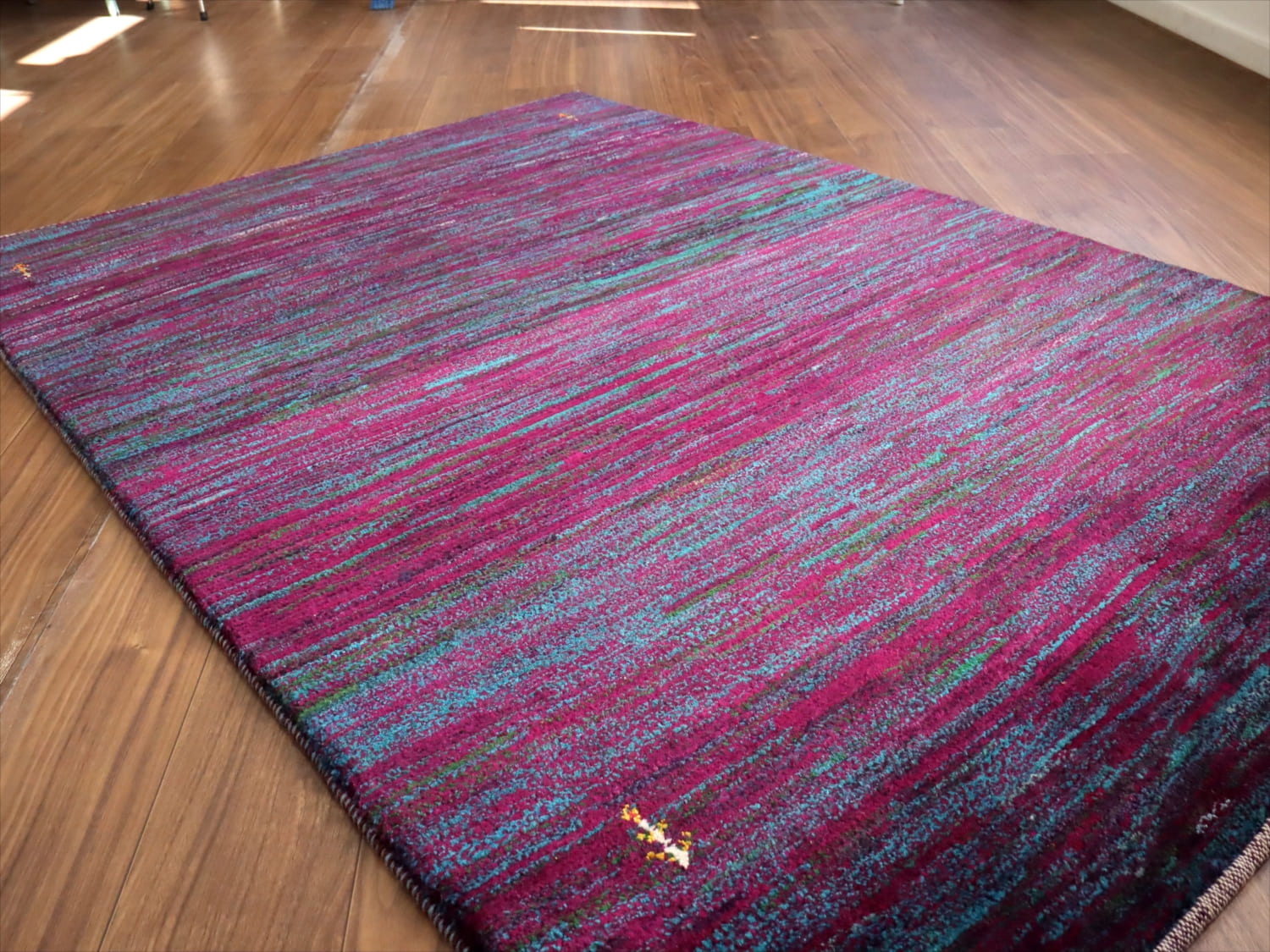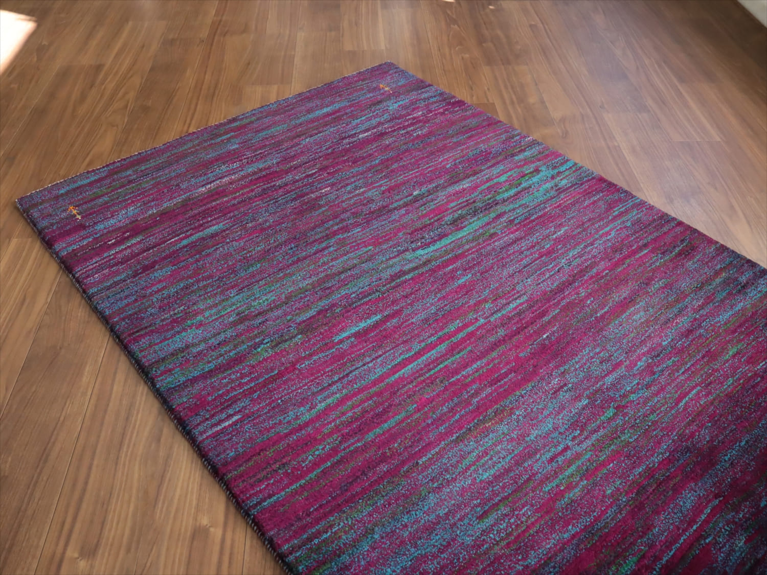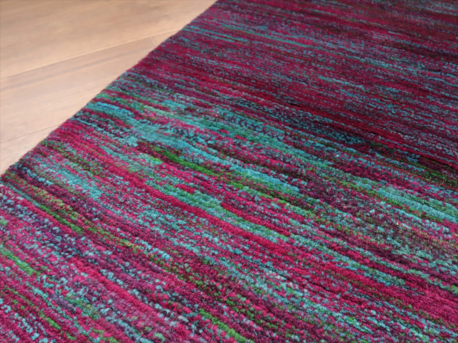| 発色のよい紫と青をランダムにストライプ状に重ねた抽象画のようなデザイン。細かく見ると、グリーンやアイボリーなども散りばめられて、複雑で深みのある色使いです。かなり個性的で存在感があります。まさに世界で一枚のラグですね。 |