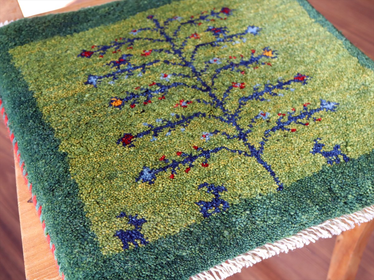 ギャッベ イラン産手織り 座布団サイズ38×38cm グリーン 動物と生命の樹