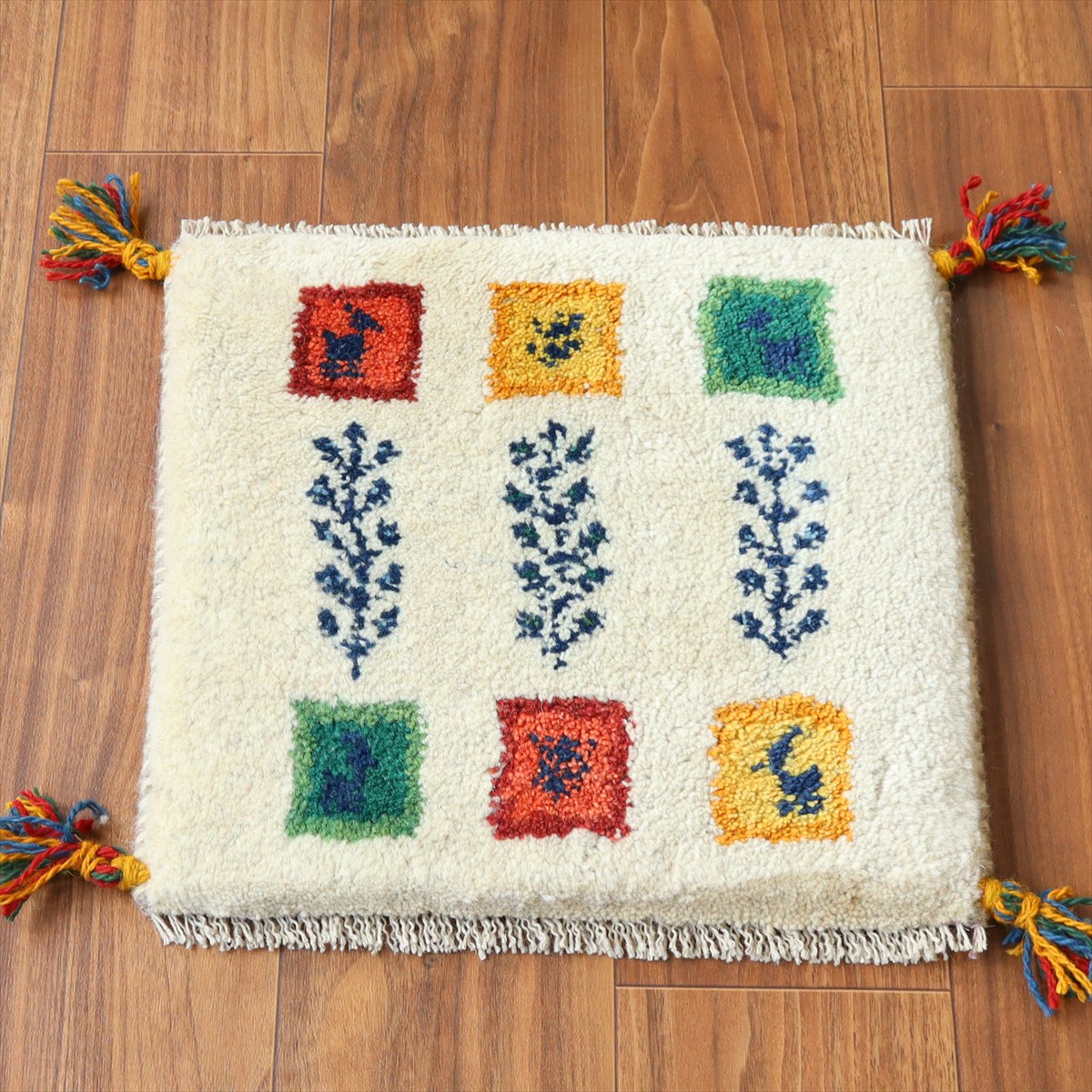 - ギャッベ イラン産手織り 座布団サイズ38×40cm ナチュラルアイボリー 動物と連なる生命の樹