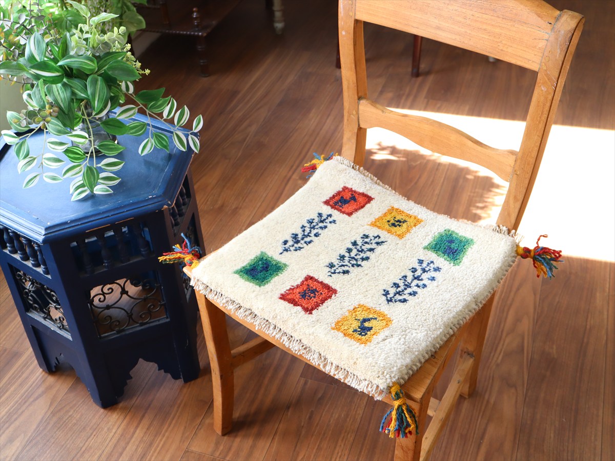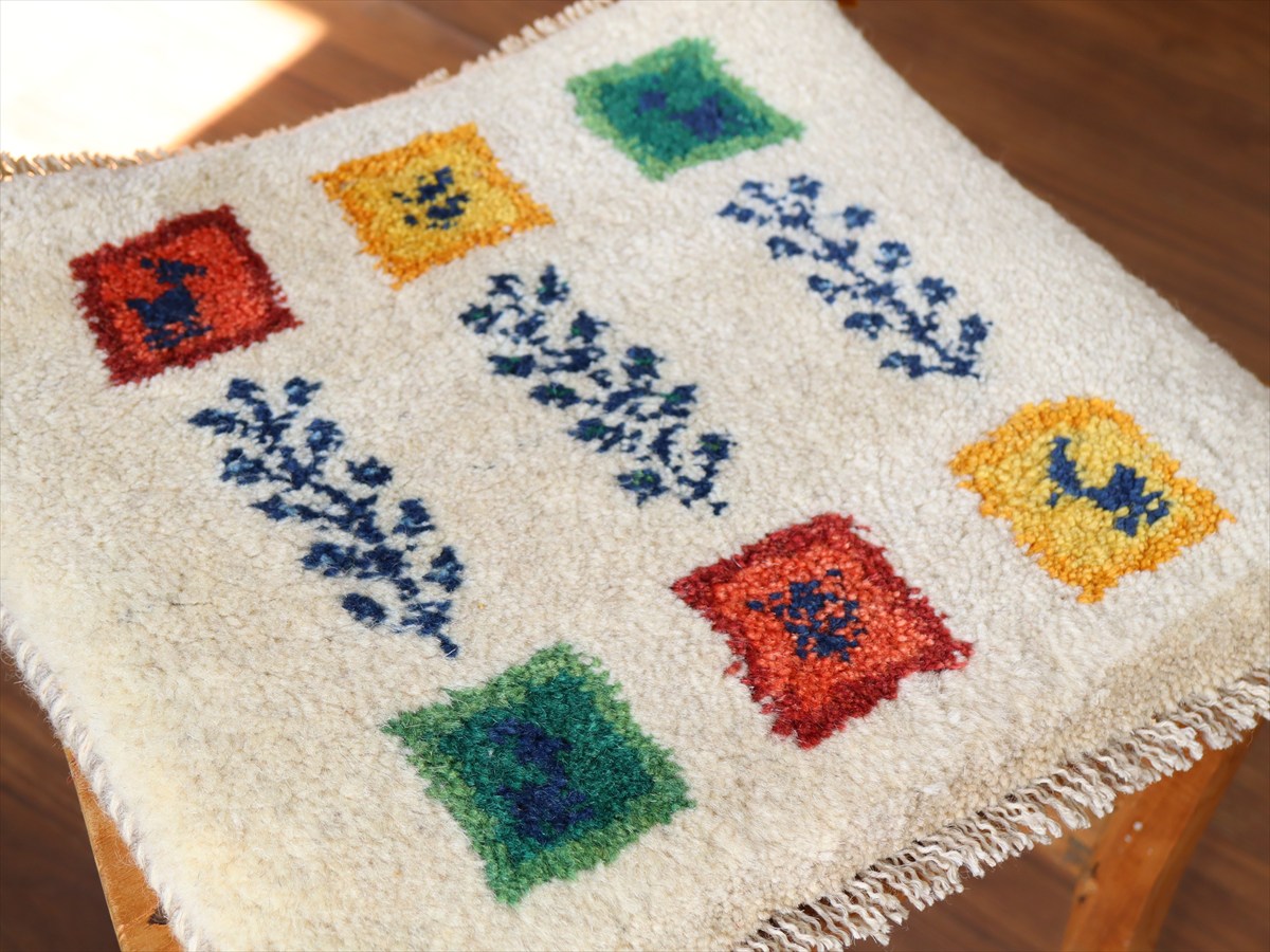ギャッベ イラン産手織り 座布団サイズ38×40cm ナチュラルアイボリー 動物と連なる生命の樹