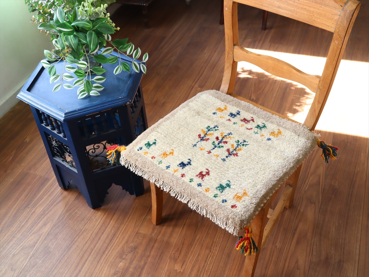 - ギャッベ イラン産手織り 座布団サイズ42×43cm ナチュラルアイボリー カラフルな動物と生命の樹