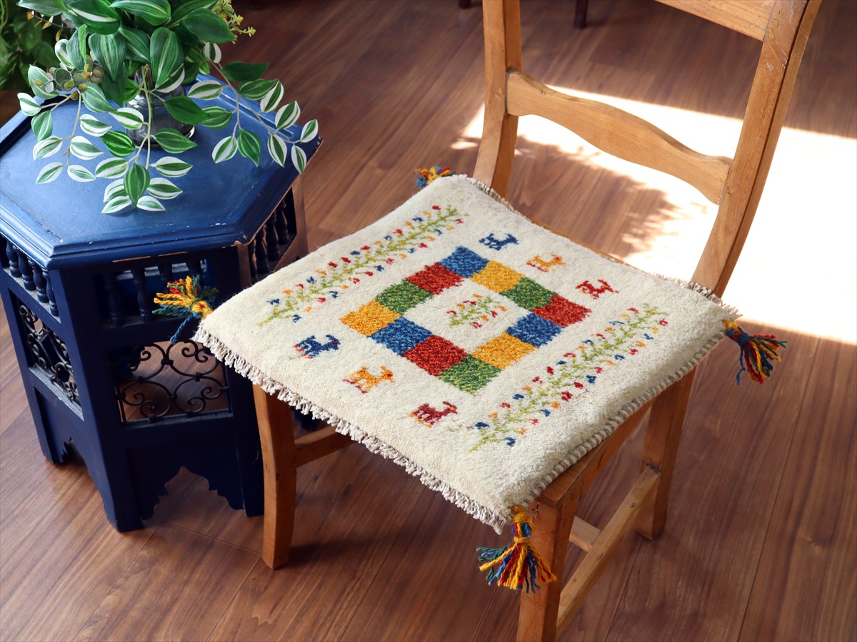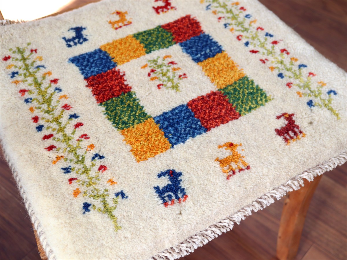 - ギャッベ イラン産手織り 座布団サイズ39×42cm ナチュラルアイボリー 動物と連なるカラフルな生命の樹