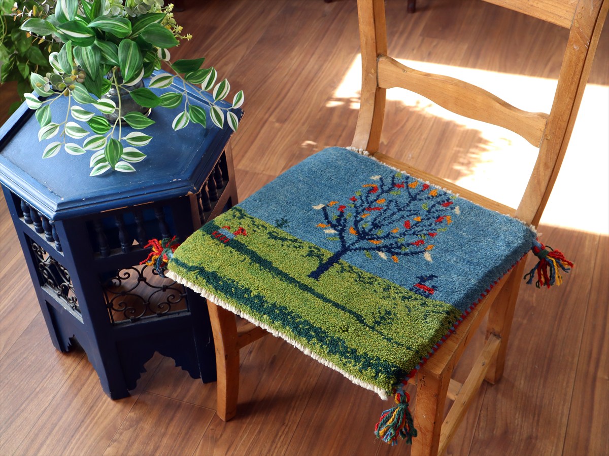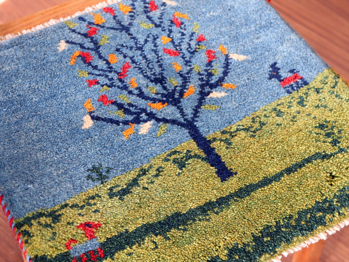 ギャッベ イラン産手織り 座布団サイズ38×41cm ブルー&グリーン 動物と生命の樹 風景画