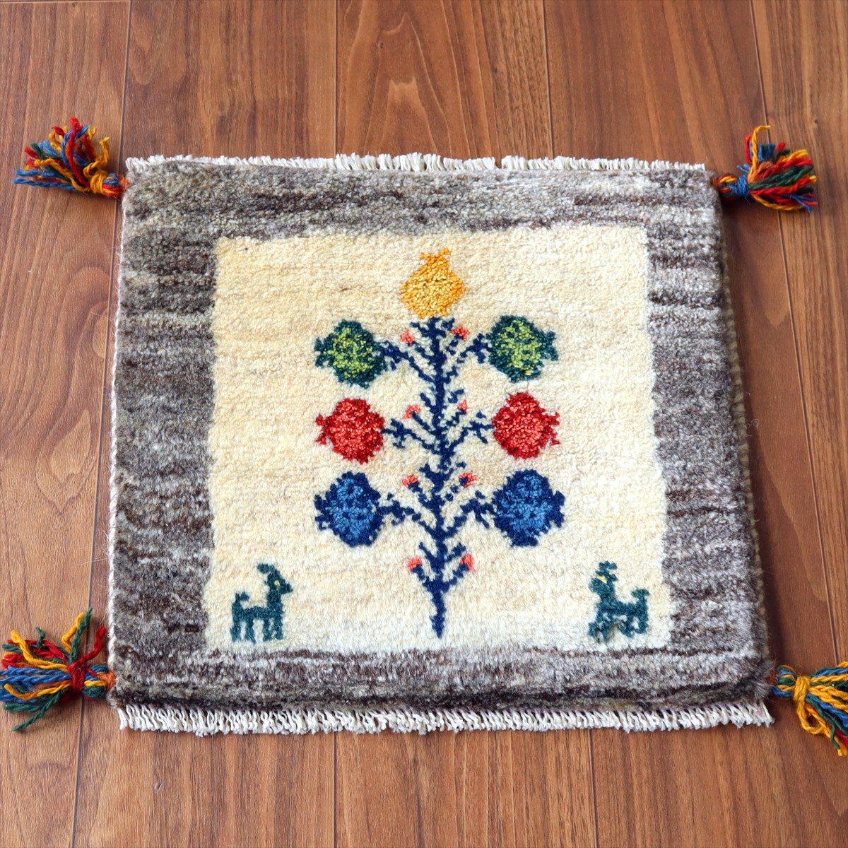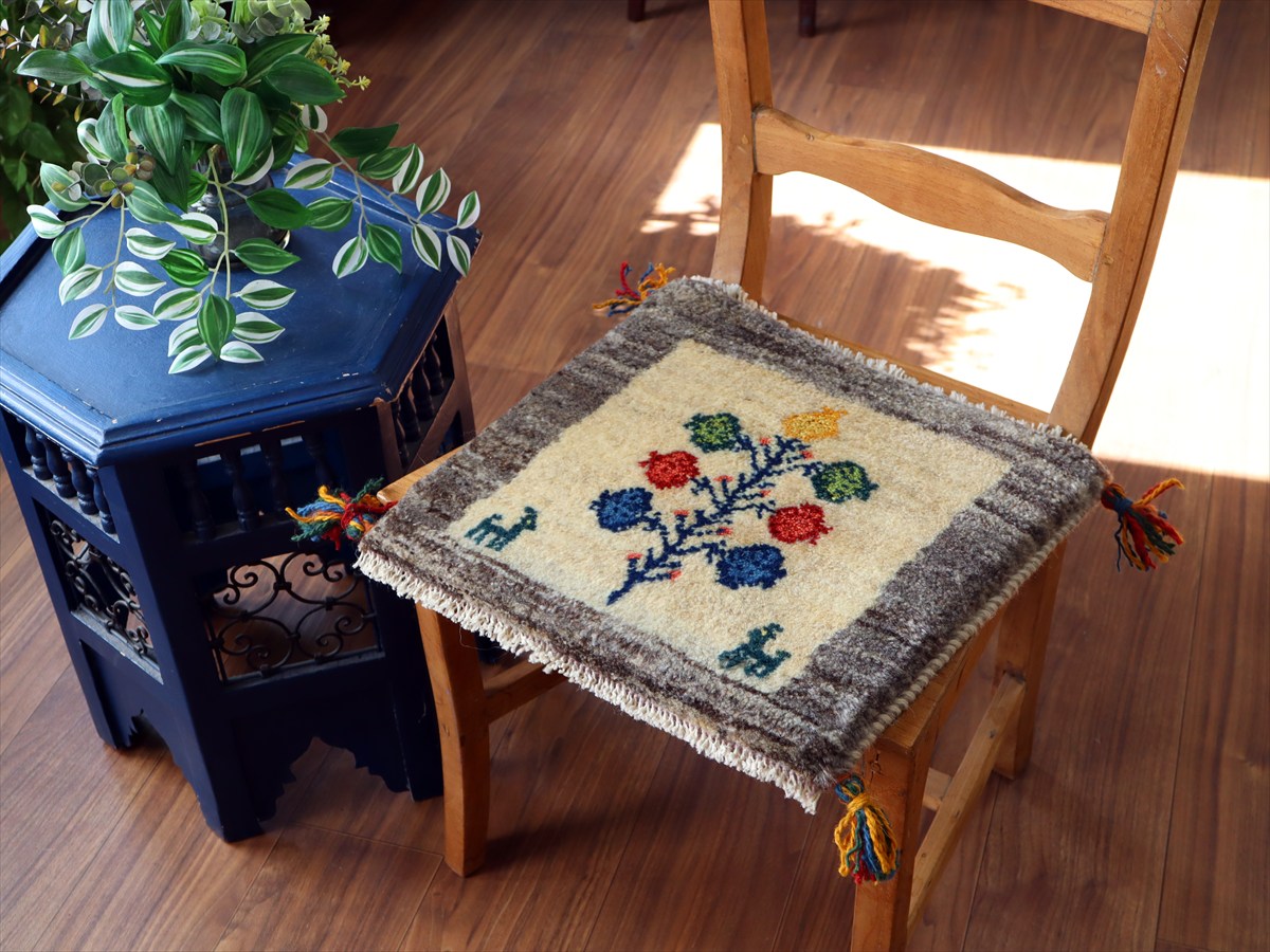 - ギャッベ イラン産手織り 座布団サイズ39×41cm ナチュラルアイボリー 動物とカラフルなザクロの樹