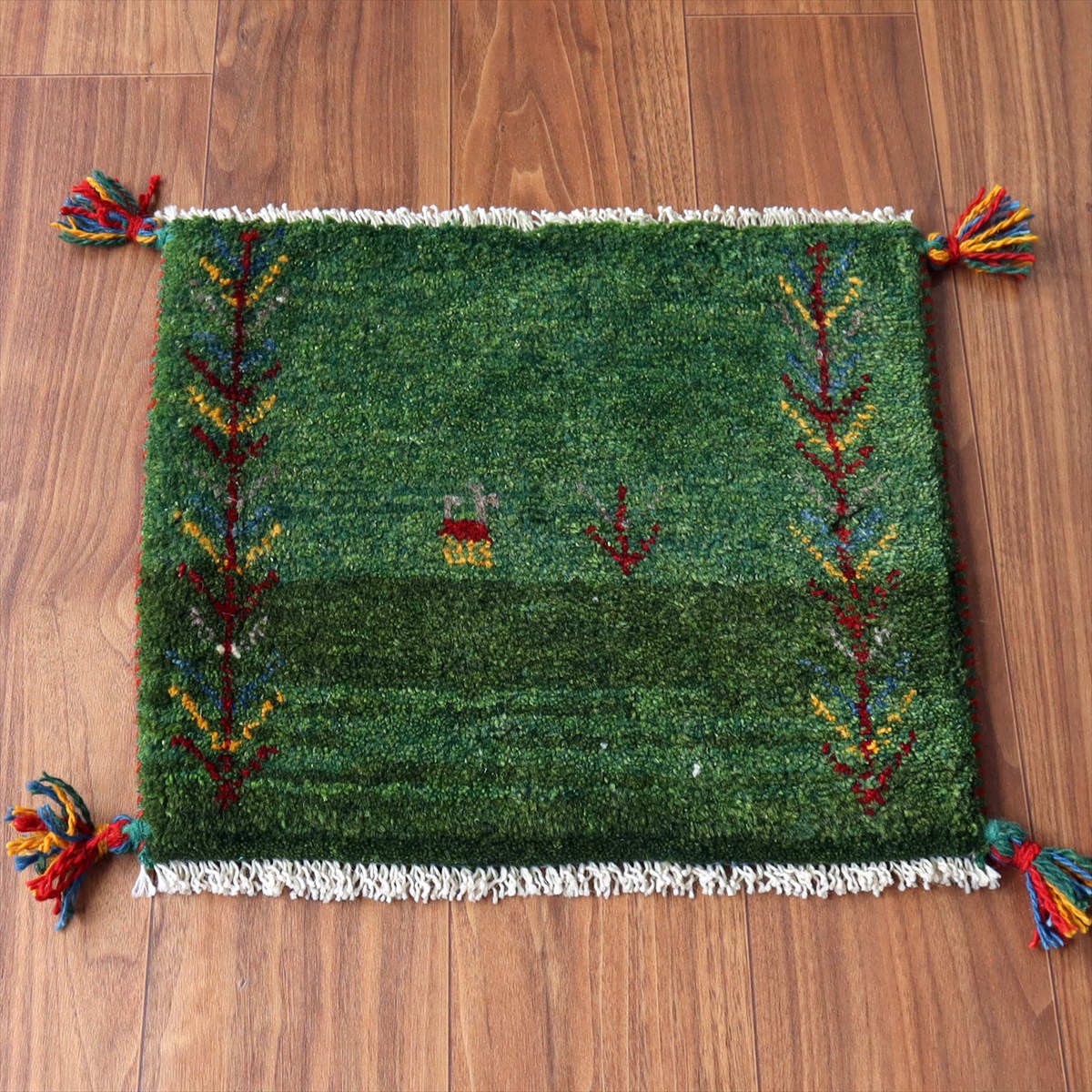 ギャッベ イラン産手織り 座布団サイズ40×45cm グリーン 動物と連なる生命の樹
