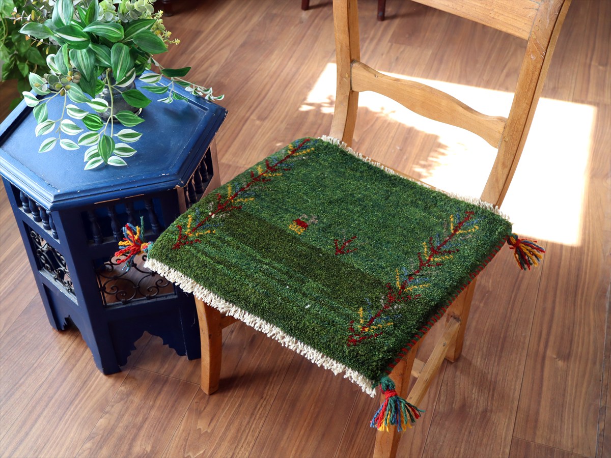 Key:イラン直輸入, GABBEH, ギャッベ, ギャベ, グリーン, 緑, 手織り, 手紡ぎ, ウール, 天然素材, ポンポン, 座布団, バザールギャッベ, ハンドメイド, 一点もの, 現品販売,ガラタバザール, 東京中野区