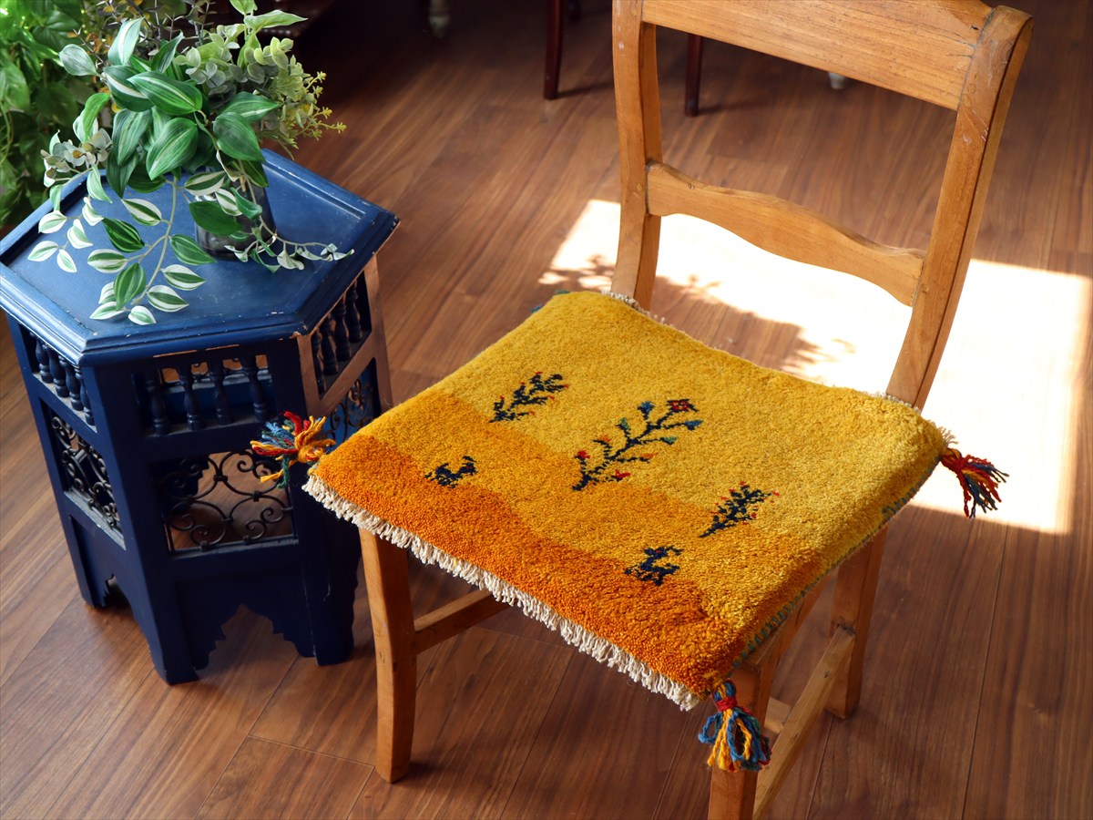 | 何枚も集めたくなる、40cm角の座布団サイズギャベ。四隅に大きなポンポンのついた、伝統的なスタイルでおられています。フローリングに並べて座布団がわりに使ったり、ベンチやダイニングチェアの座面など、使い方はいろいろ。壁にタペストリーのように飾るのもおすすめです。 |