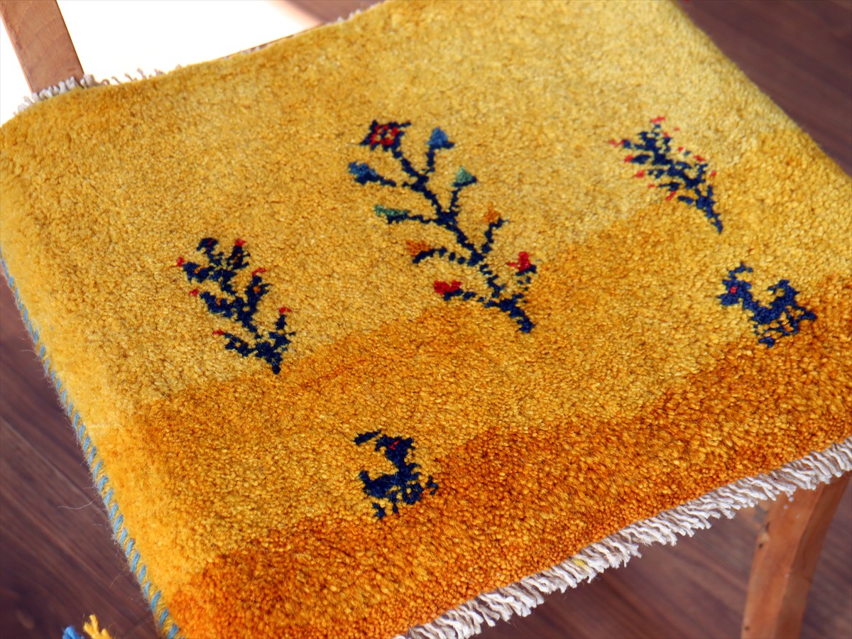 ギャッベ イラン産手織り 座布団サイズ39×43cm イエローオレンジ 動物と生命の樹 風景画
