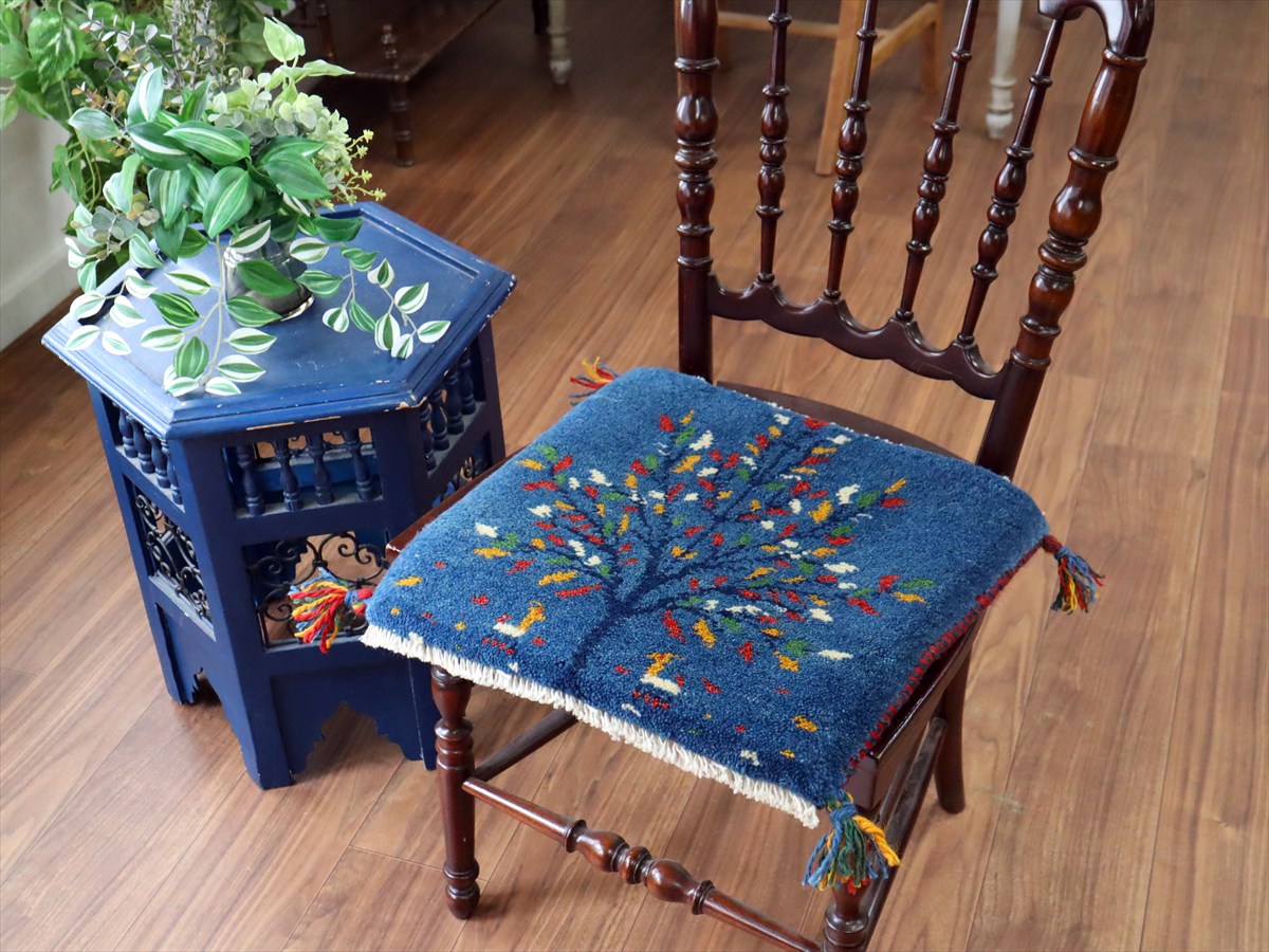 ギャッベ イラン産手織り 座布団サイズ40×43cm ブルー 動物とカラフルな生命の樹