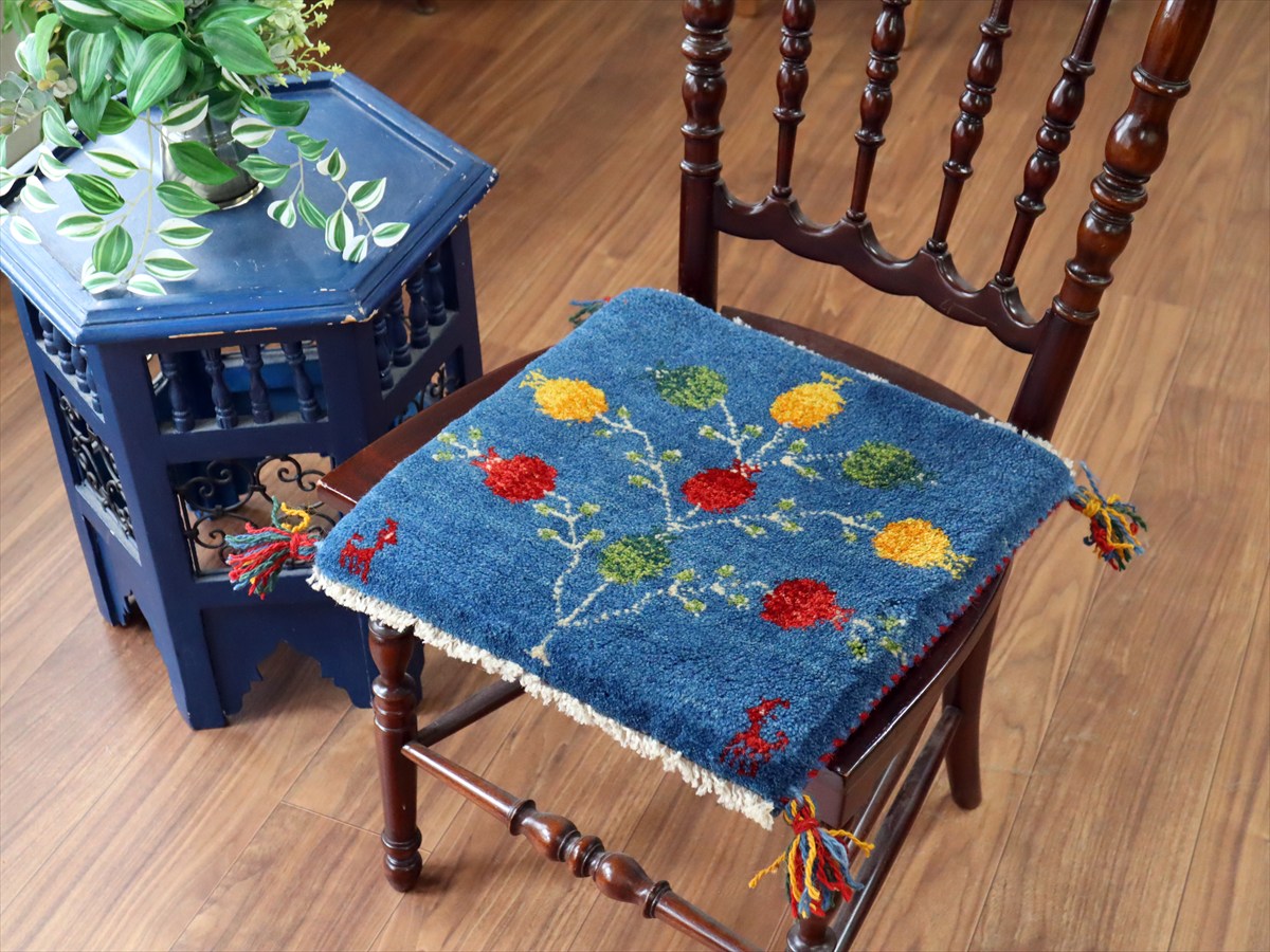 ギャッベ イラン産手織り 座布団サイズ39×40cm ブルー 動物とカラフルなザクロの樹