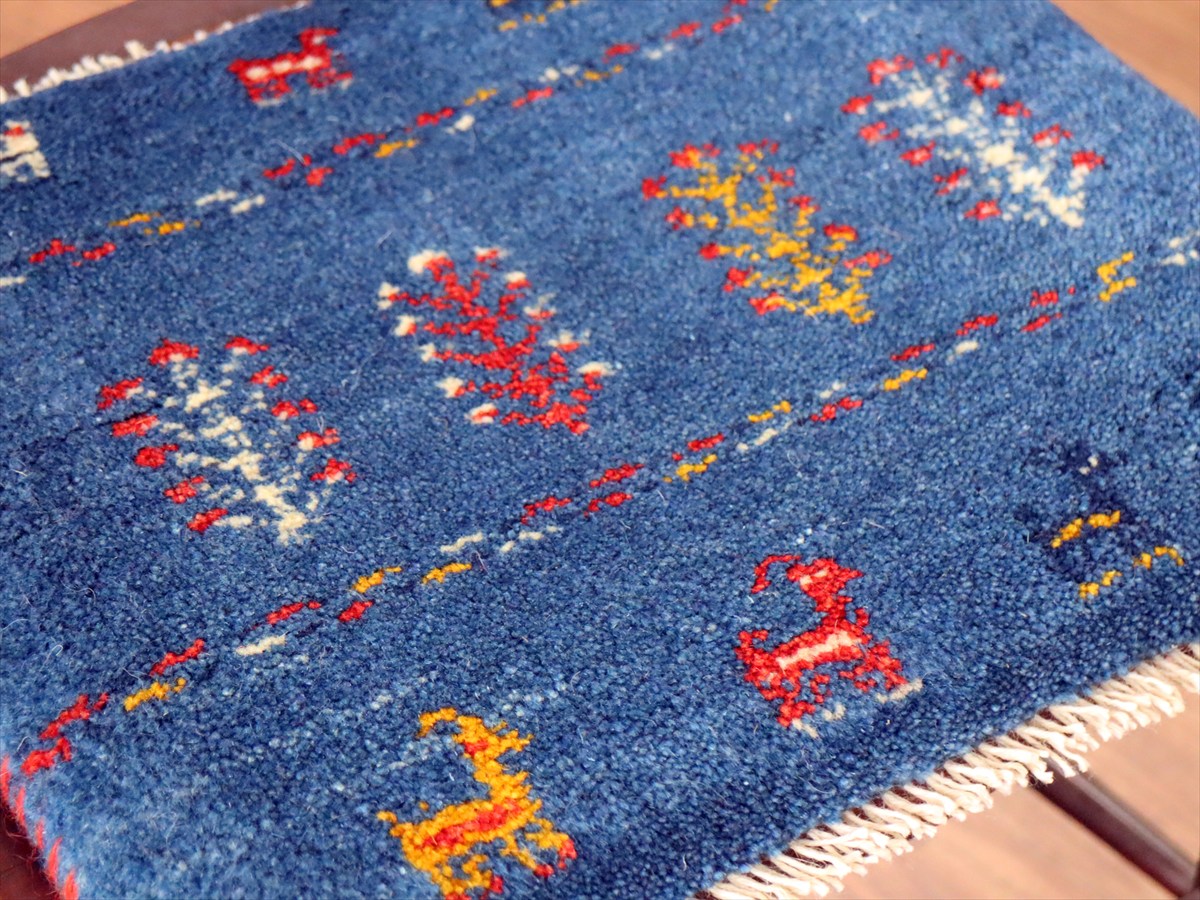 ギャッベ イラン産手織り 座布団サイズ37×43cm ブルー 動物と連なる生命の樹