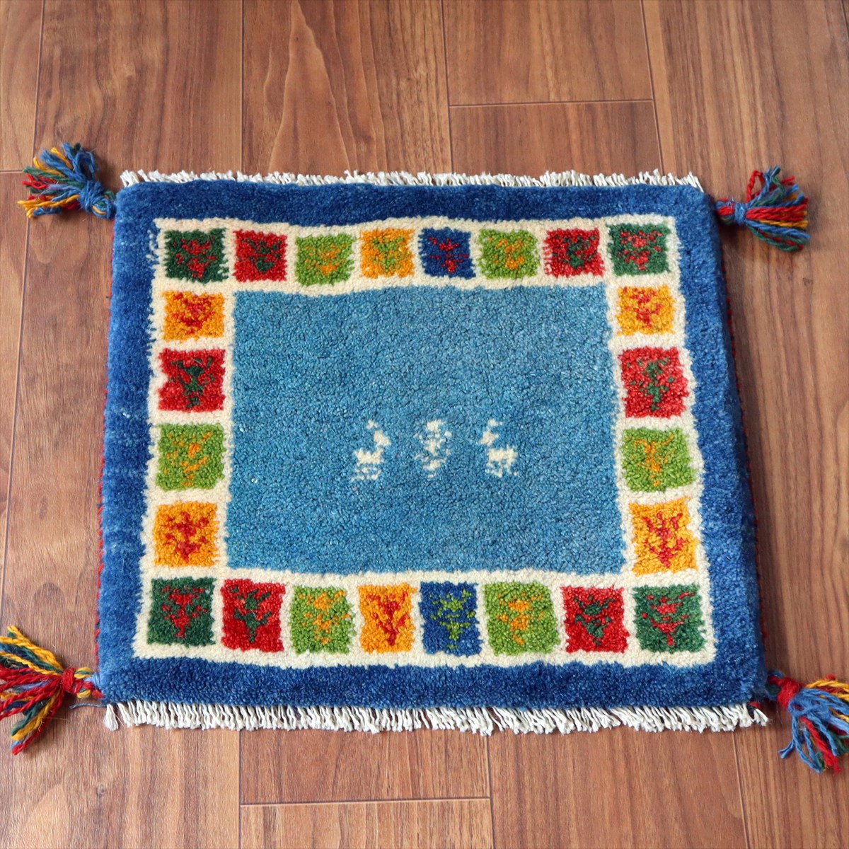 ギャッベ イラン産手織り 座布団サイズ38×43cm ブルー カラフルタイル 動物と生命の樹