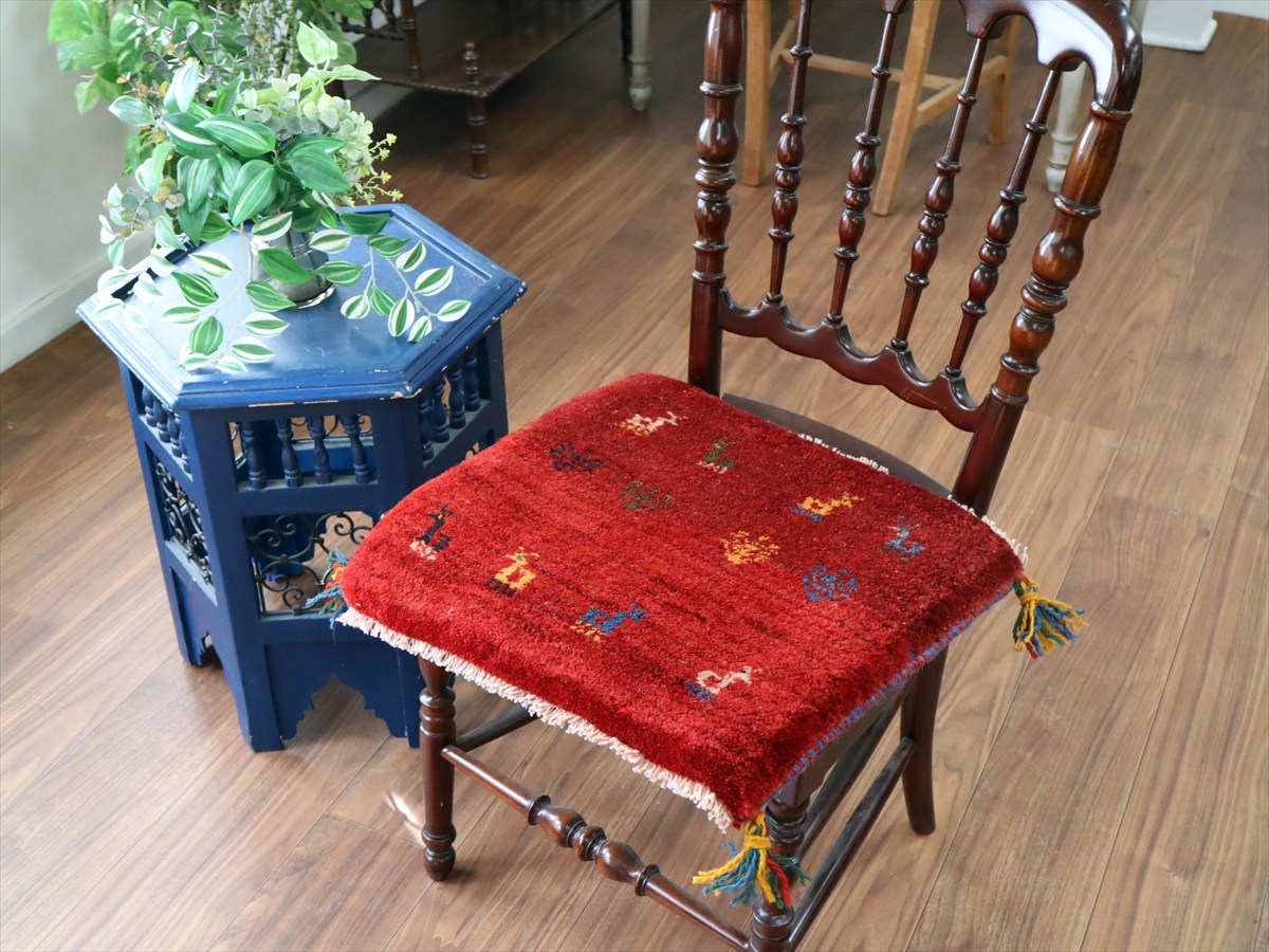 | 何枚も集めたくなる、40cm角の座布団サイズギャベ。四隅に大きなポンポンのついた、伝統的なスタイルでおられています。フローリングに並べて座布団がわりに使ったり、ベンチやダイニングチェアの座面など、使い方はいろいろ。壁にタペストリーのように飾るのもおすすめです。 |
