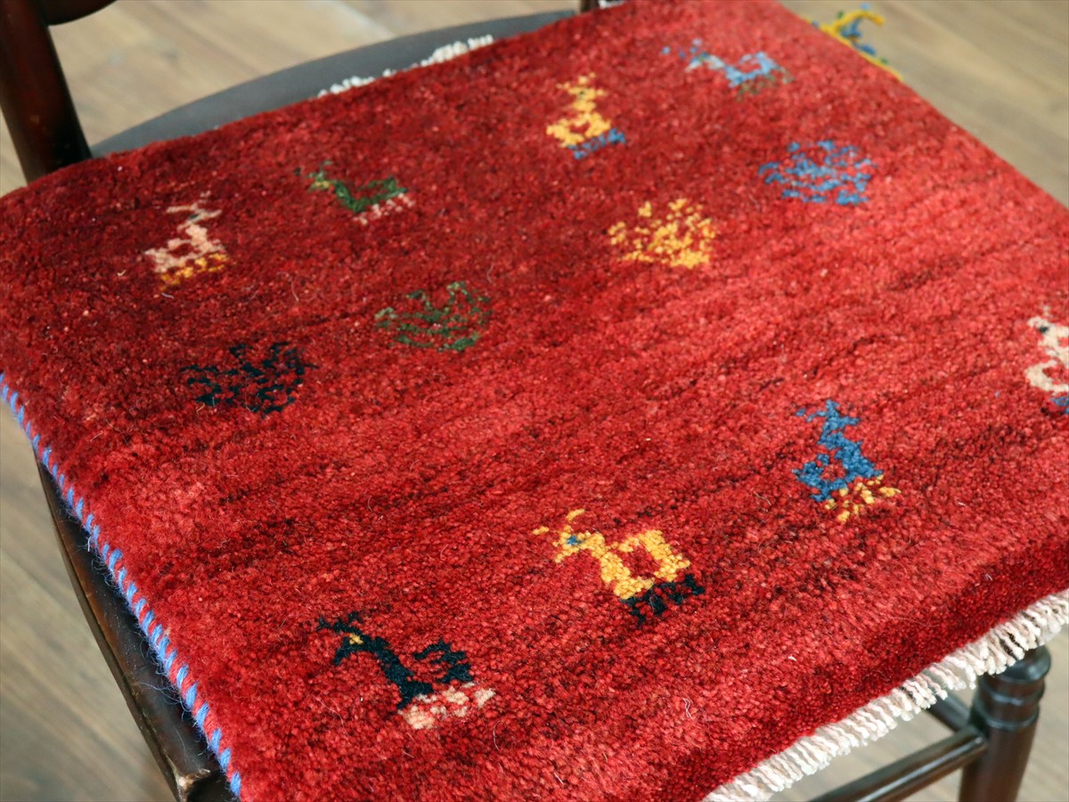 ギャッベ イラン産手織り 座布団サイズ41×45cm レッド カラフルな生命の樹と動物