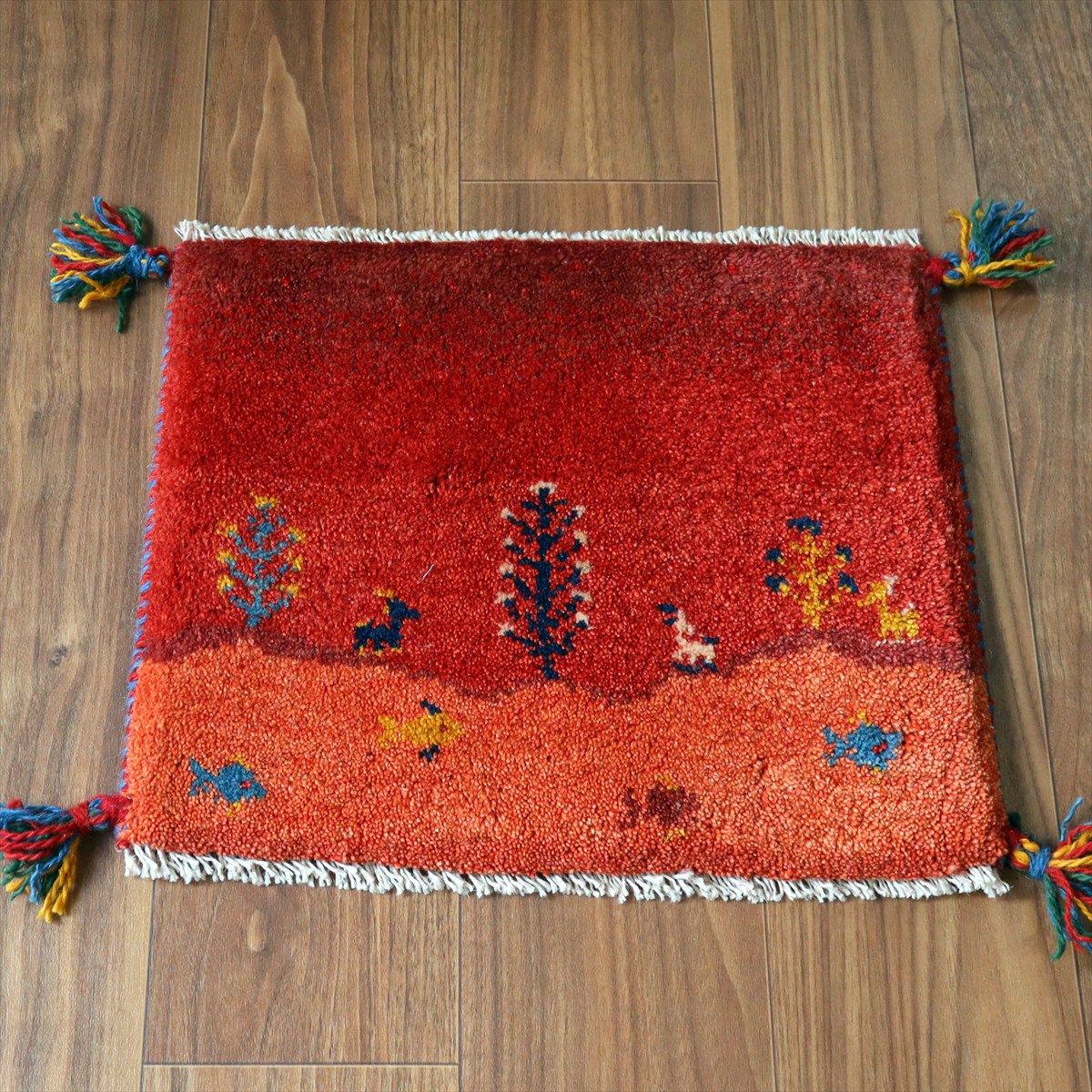 ギャッベ イラン産手織り 座布団サイズ38×45cm レッド 生命の樹と動物 風景画