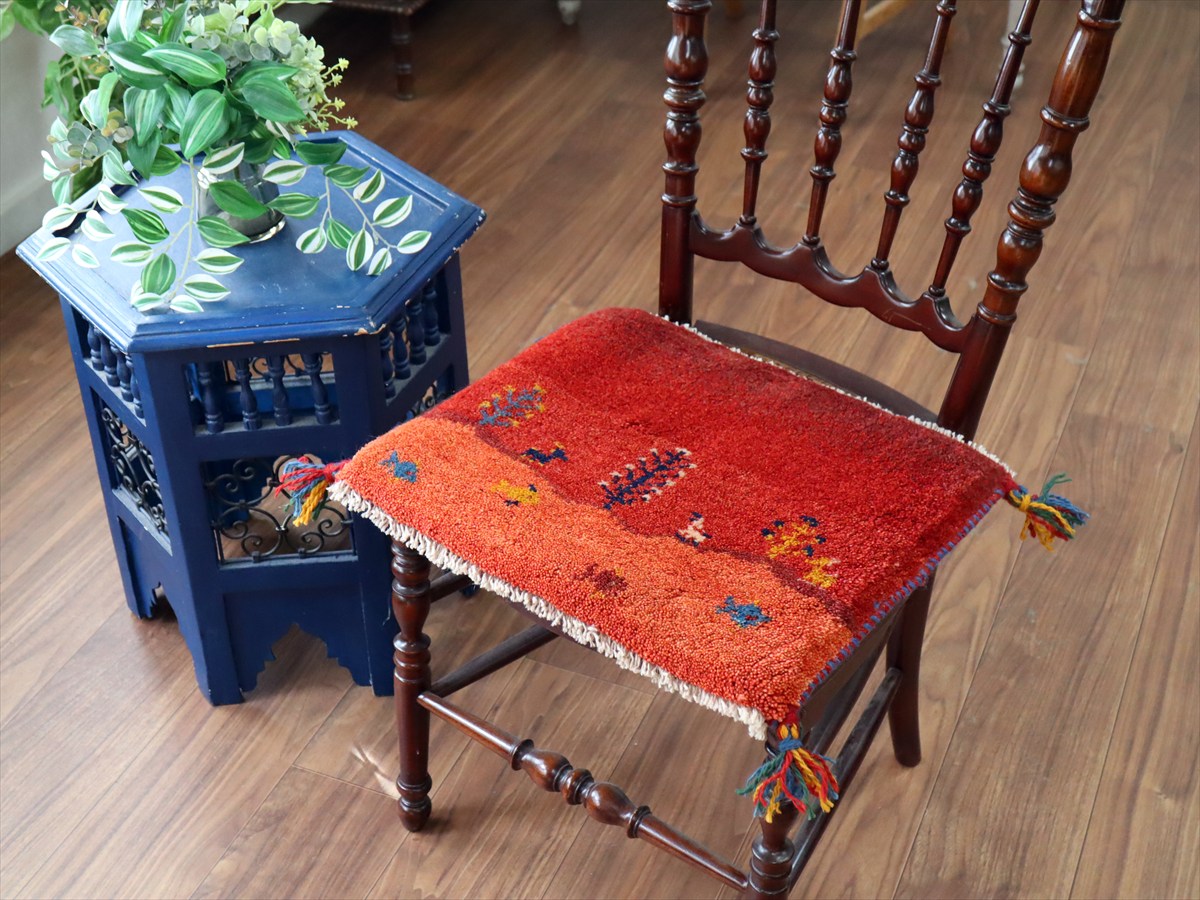 | 何枚も集めたくなる、40cm角の座布団サイズギャベ。四隅に大きなポンポンのついた、伝統的なスタイルでおられています。フローリングに並べて座布団がわりに使ったり、ベンチやダイニングチェアの座面など、使い方はいろいろ。壁にタペストリーのように飾るのもおすすめです。 |