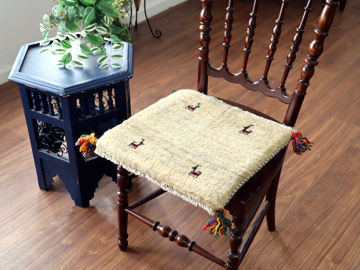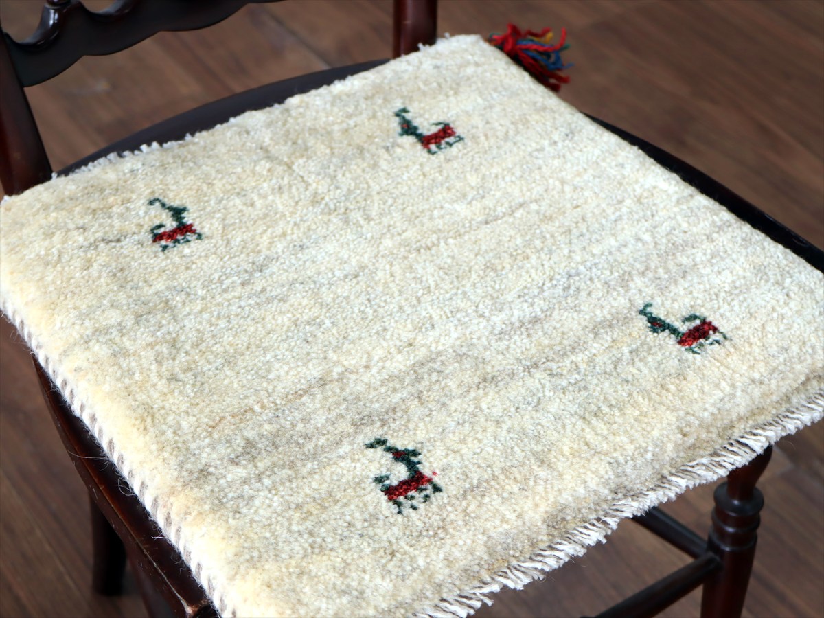 ギャッベ イラン産手織り 座布団サイズ39×40cm ナチュラルアイボリー 動物モチーフ