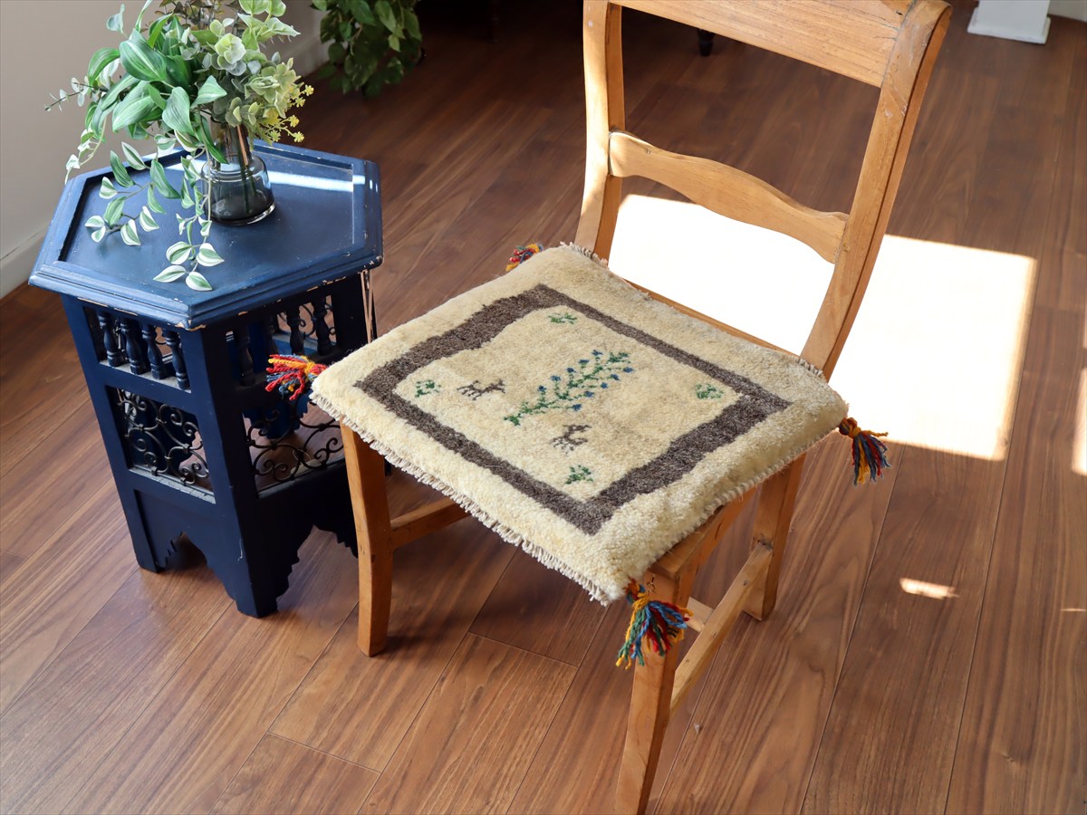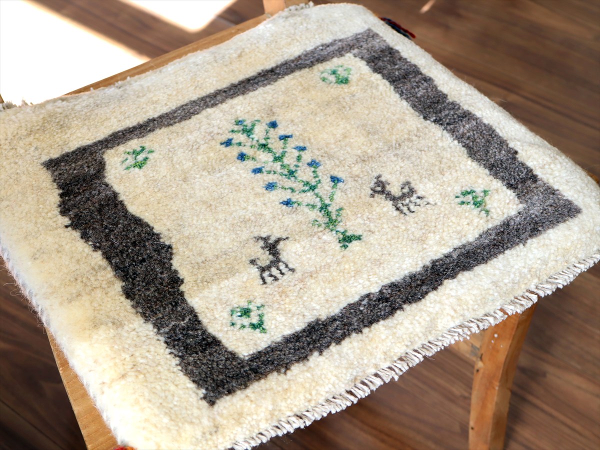 ギャッベ イラン産手織り 座布団サイズ39×42cm ナチュラルアイボリー 生命の樹と動物