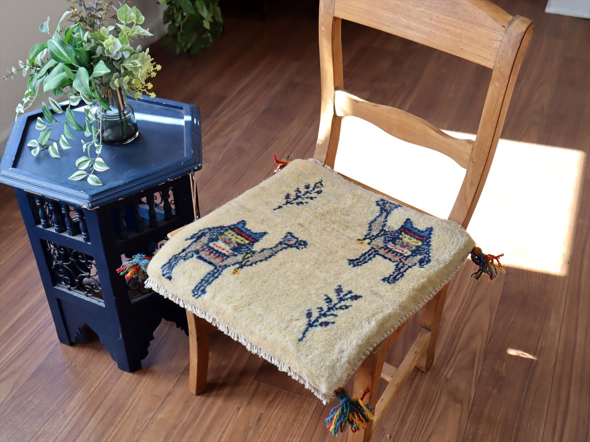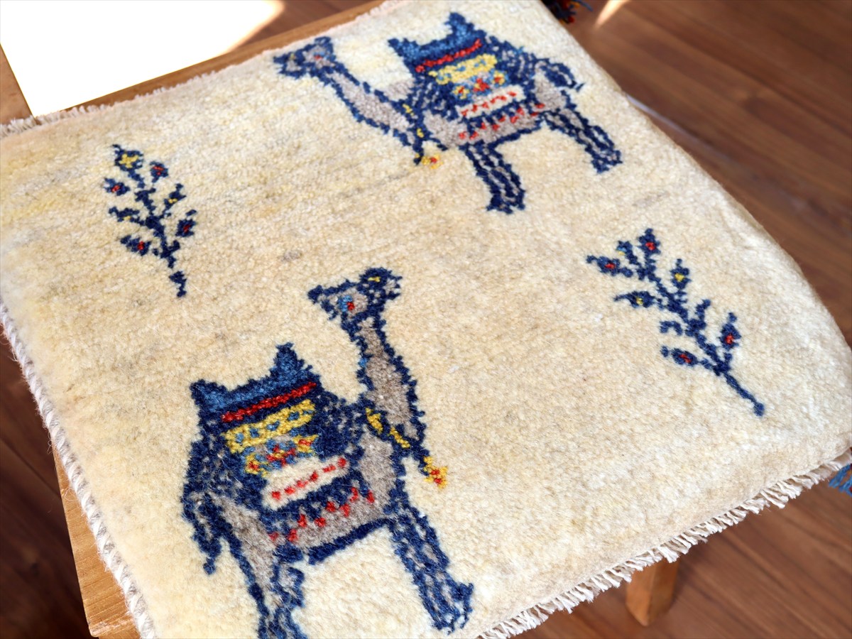 ギャッベ イラン産手織り 座布団サイズ43×43cm ナチュラルアイボリー ラクダと生命の樹