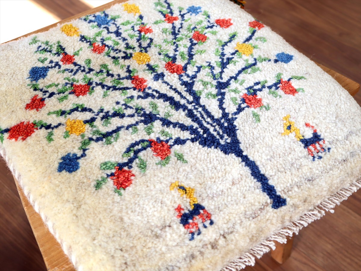 ギャッベ イラン産手織り 座布団サイズ43×40cm ナチュラルアイボリー カラフルなザクロの樹と動物