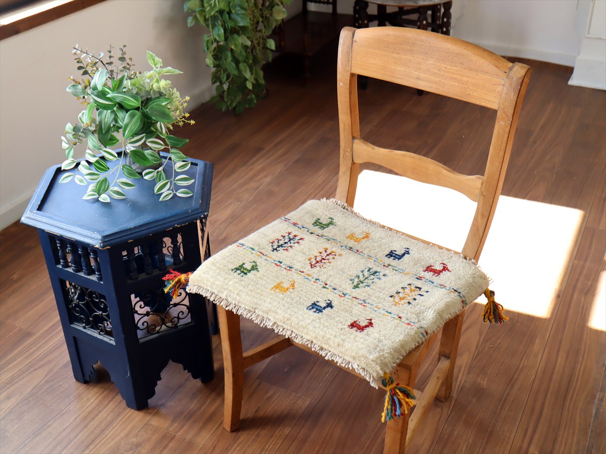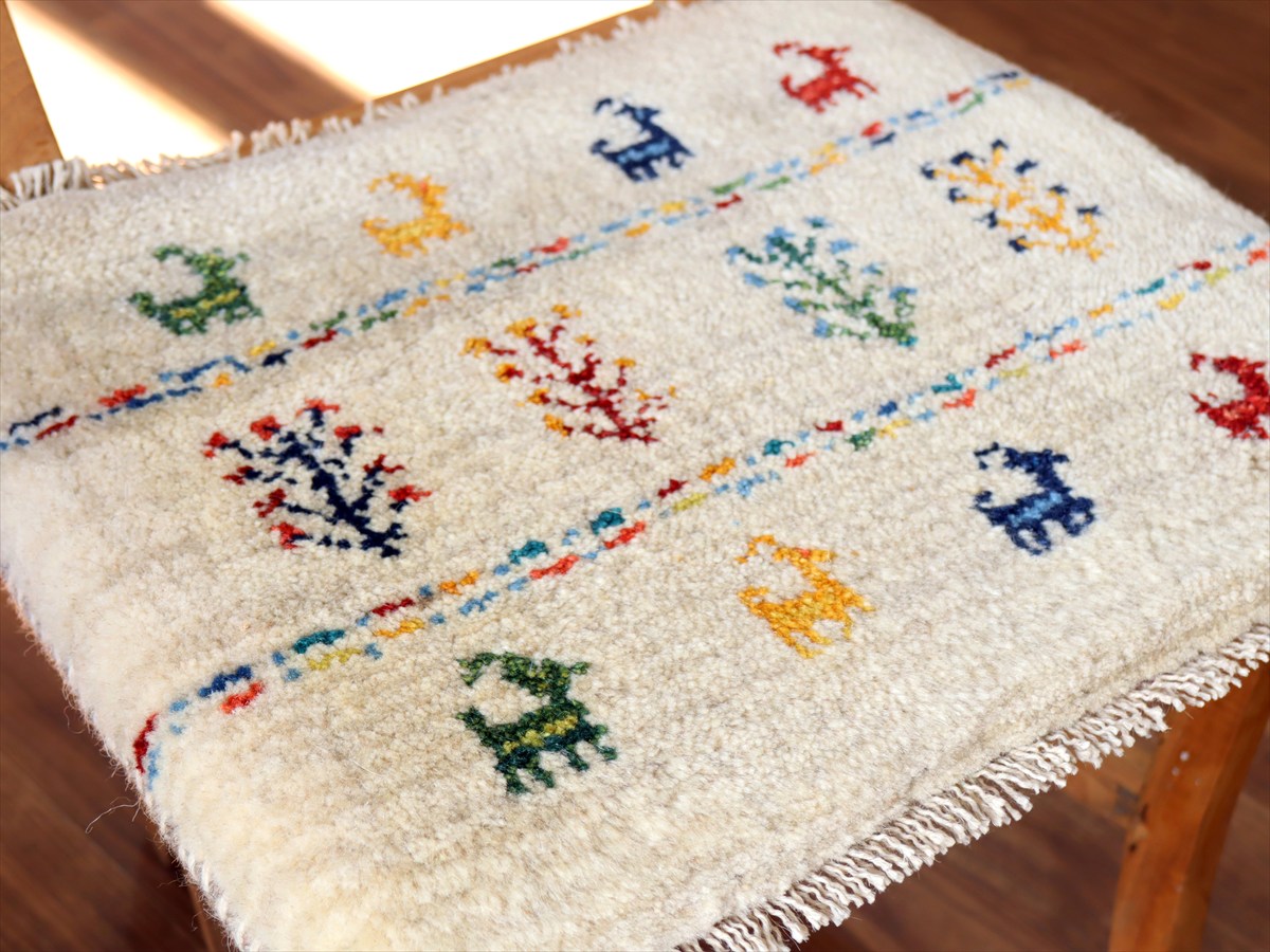 ギャッベ イラン産手織り 座布団サイズ38×46cm ナチュラルアイボリー カラフルな生命の樹と動物