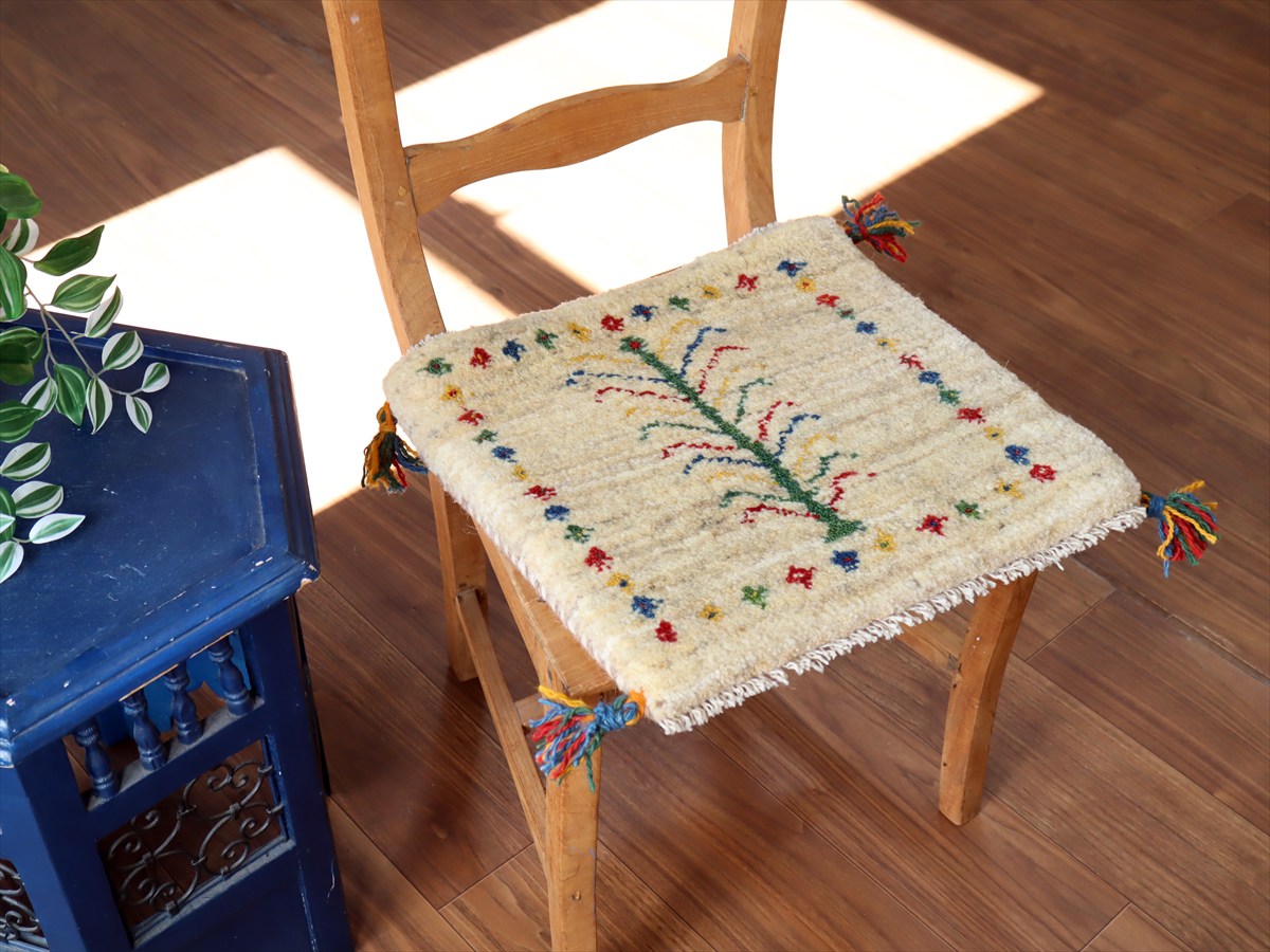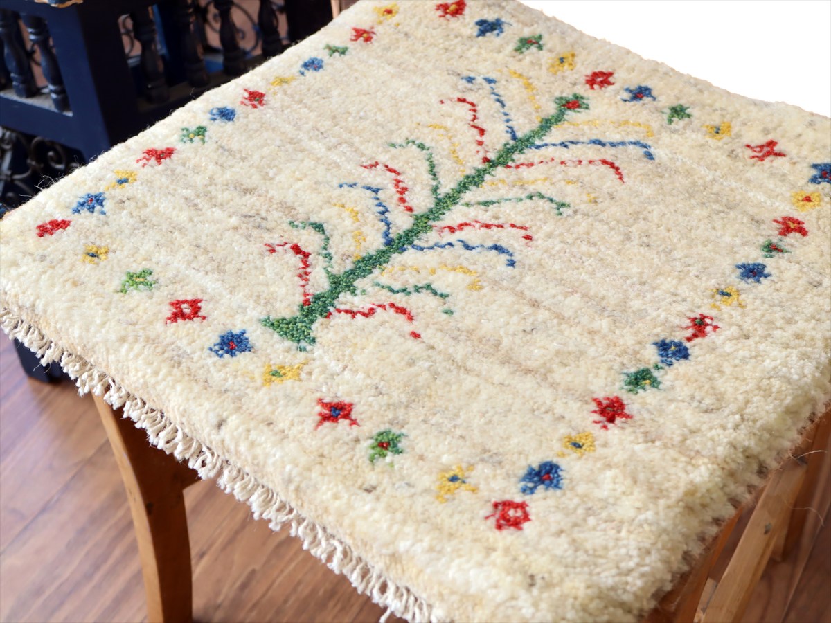 ギャッベ イラン産手織り 座布団サイズ40×42cm ナチュラルアイボリー カラフルな連なる生命の樹
