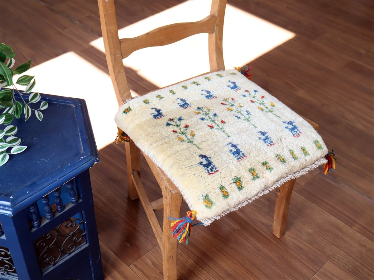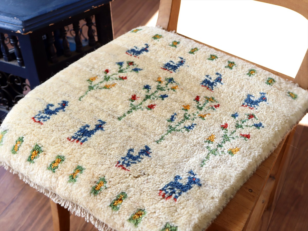 ギャッベ イラン産手織り 座布団サイズ42×40cm ナチュラルアイボリー カラフルな生命の樹と動物
