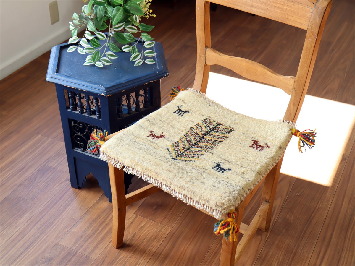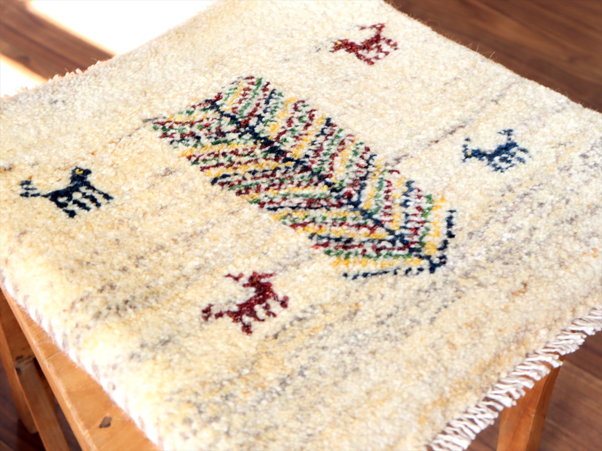 ギャッベ イラン産手織り 座布団サイズ39×40cm ナチュラルアイボリー 生命の樹と動物