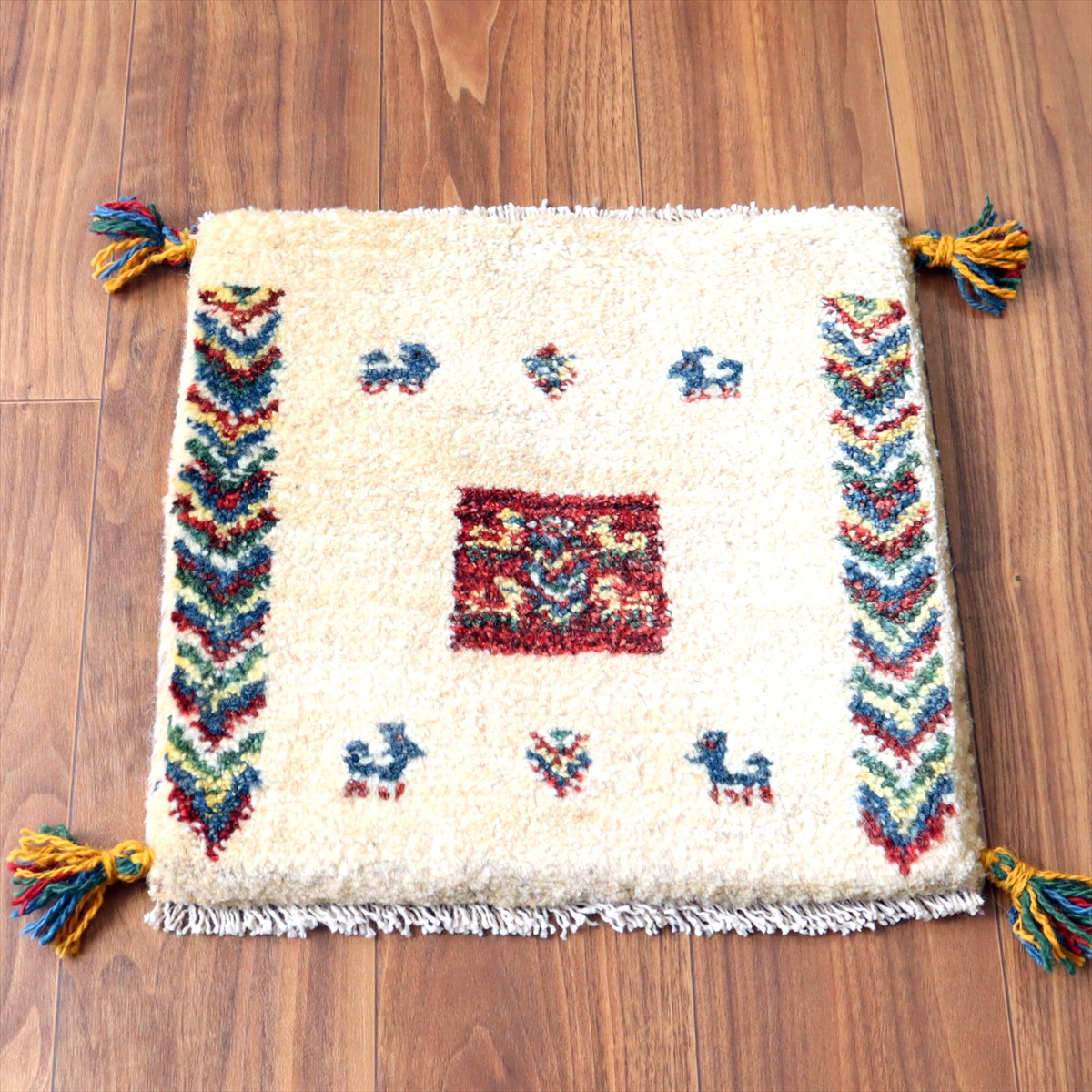- ギャッベ イラン産手織り 座布団サイズ41×41cm ナチュラルアイボリー 連なる生命の樹と動物