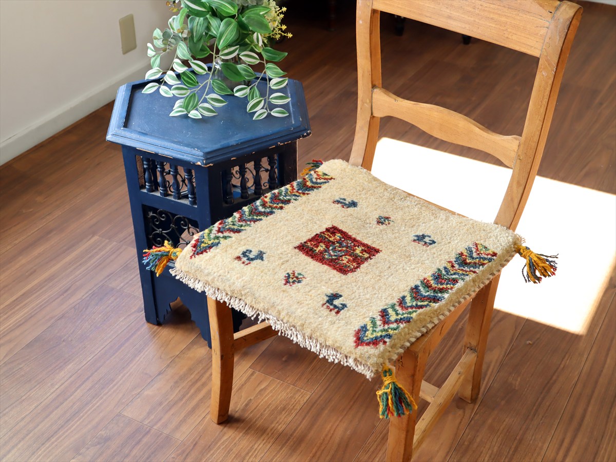 | 何枚も集めたくなる、40cm角の座布団サイズギャベ。四隅に大きなポンポンのついた、伝統的なスタイルで織られています。フローリングに並べて座布団がわりに使ったり、ベンチやダイニングチェアの座面など、使い方はいろいろ。壁にタペストリーのように飾るのもおすすめです。 |