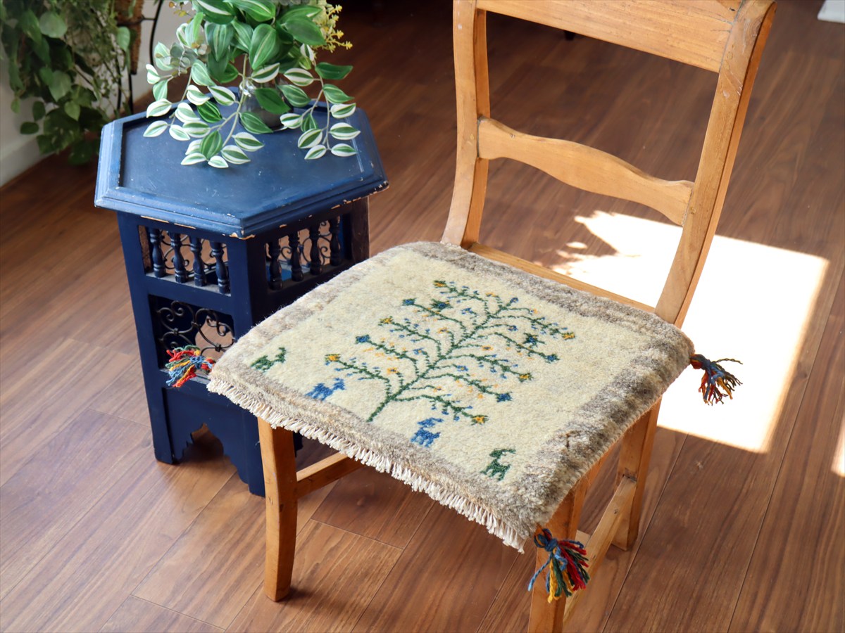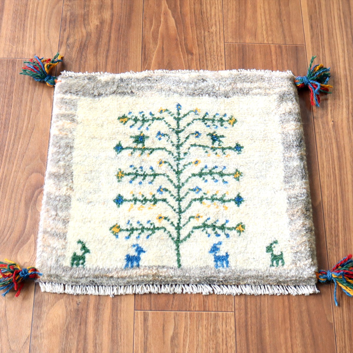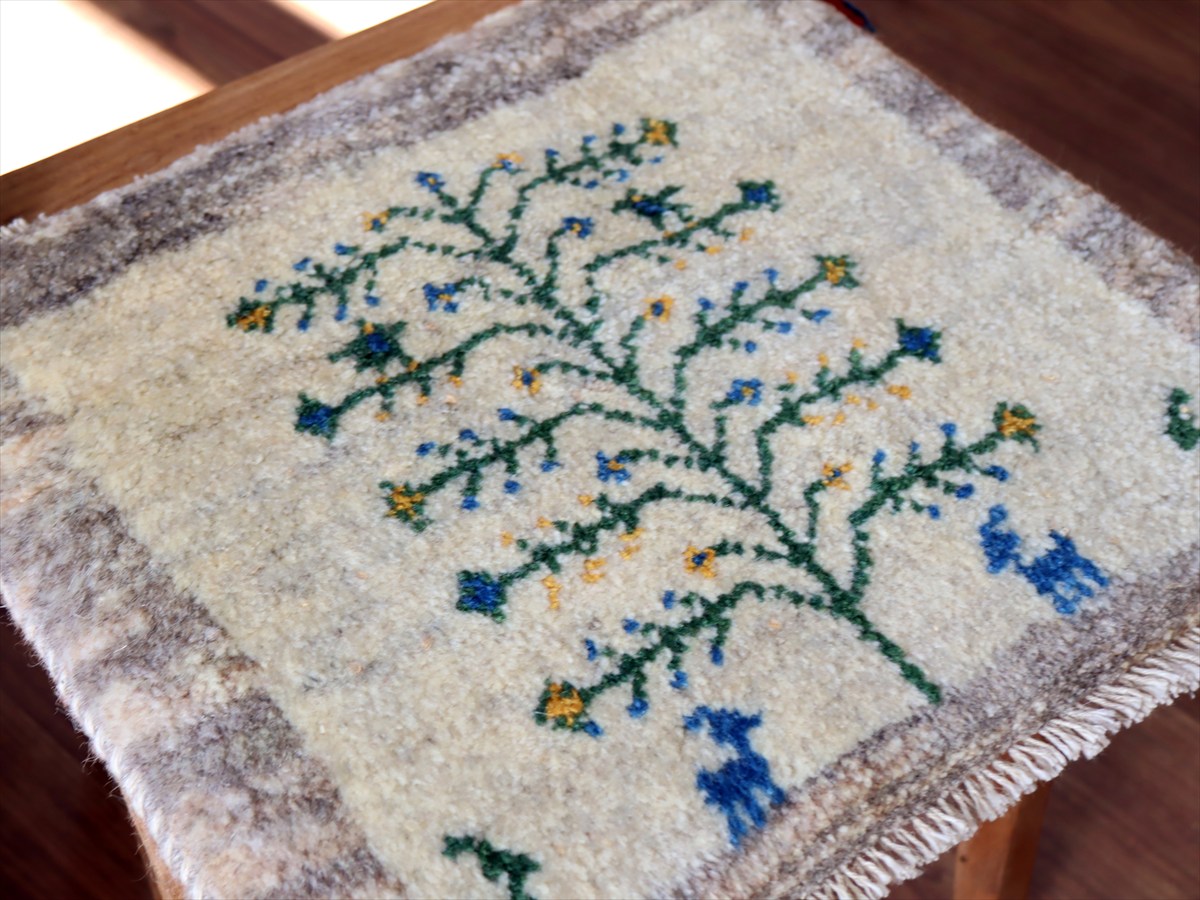 ギャッベ イラン産手織り 座布団サイズ39×43cm ナチュラルアイボリー 生命の樹と動物