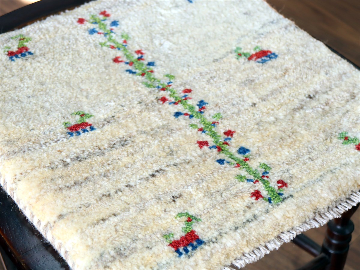 ギャッベ イラン産手織り 座布団サイズ39×40cm ナチュラルアイボリー 連なる生命の樹と動物