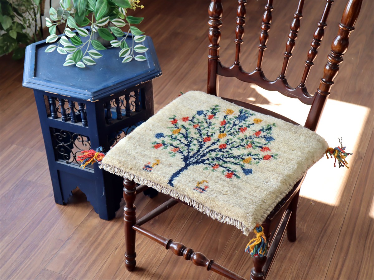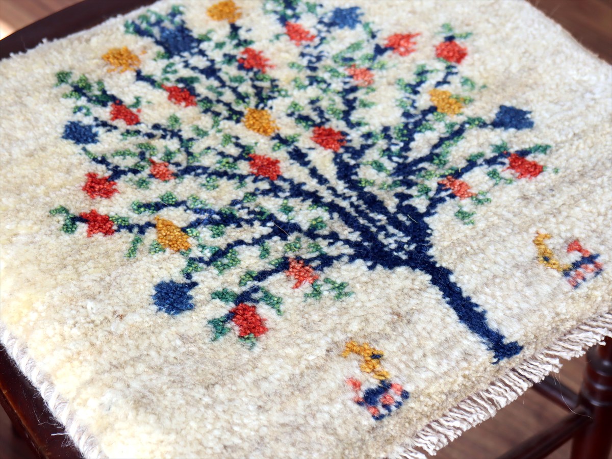 ギャッベ イラン産手織り 座布団サイズ38×43cm ナチュラルアイボリー カラフルなザクロの樹と動物