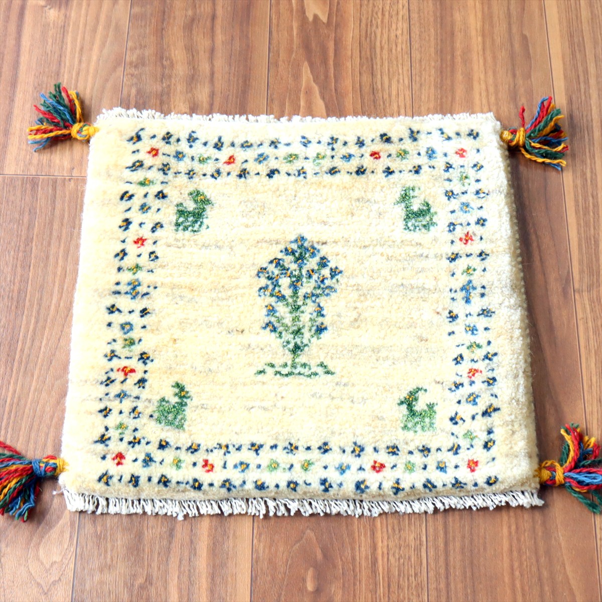 - ギャッベ イラン産手織り 座布団サイズ39×43cm ナチュラルアイボリー 生命の樹と動物