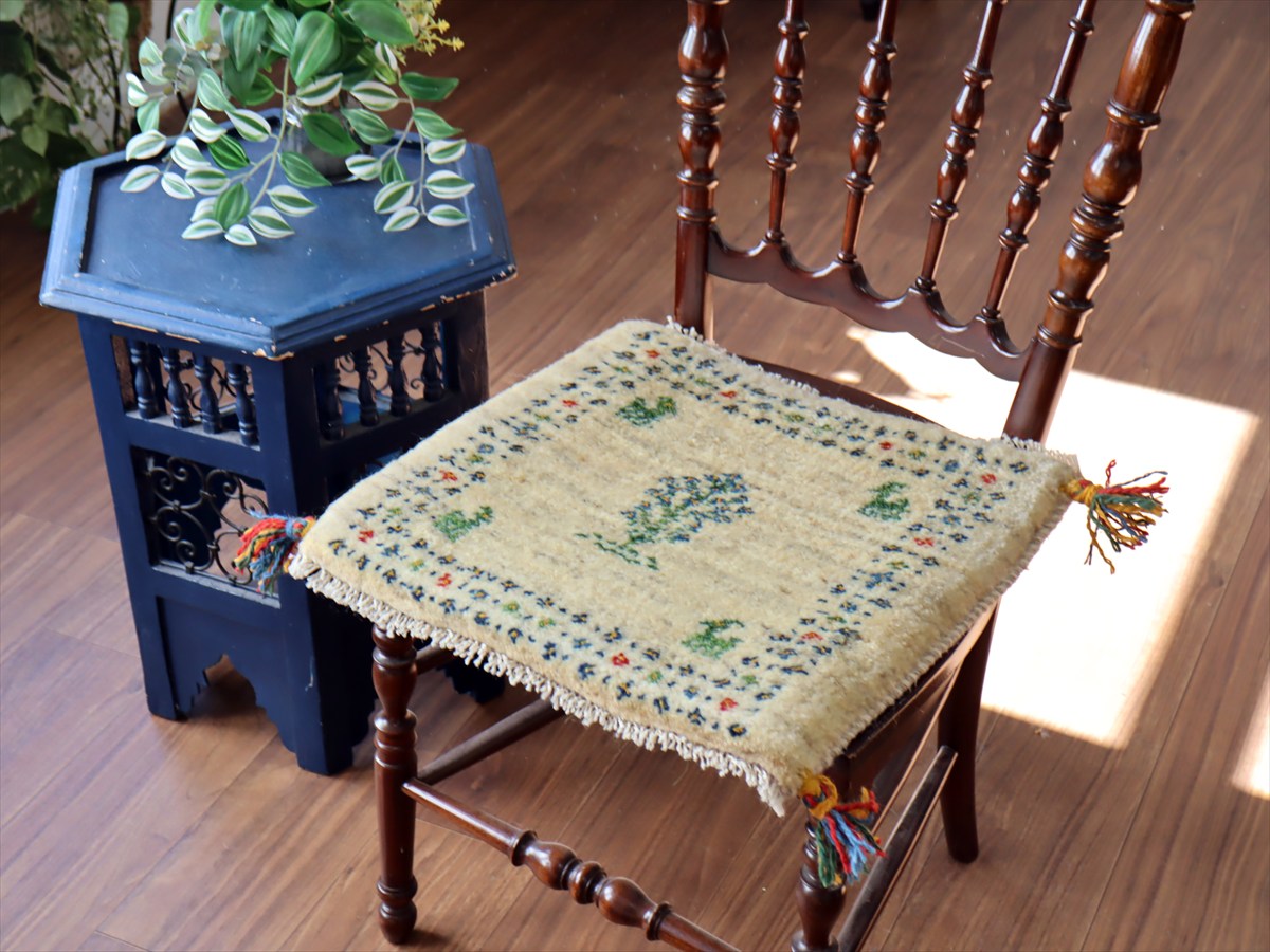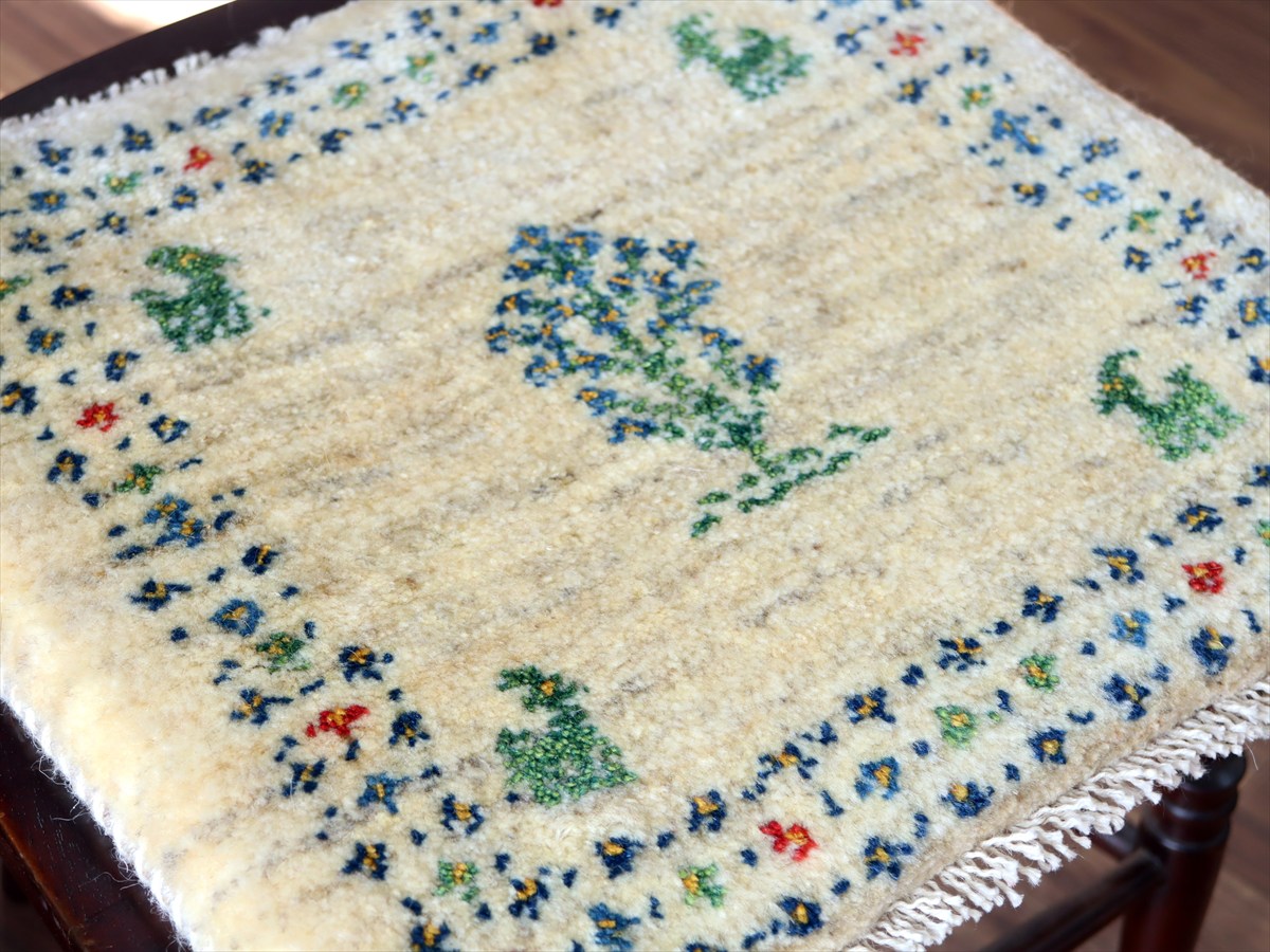 ギャッベ イラン産手織り 座布団サイズ39×43cm ナチュラルアイボリー 生命の樹と動物