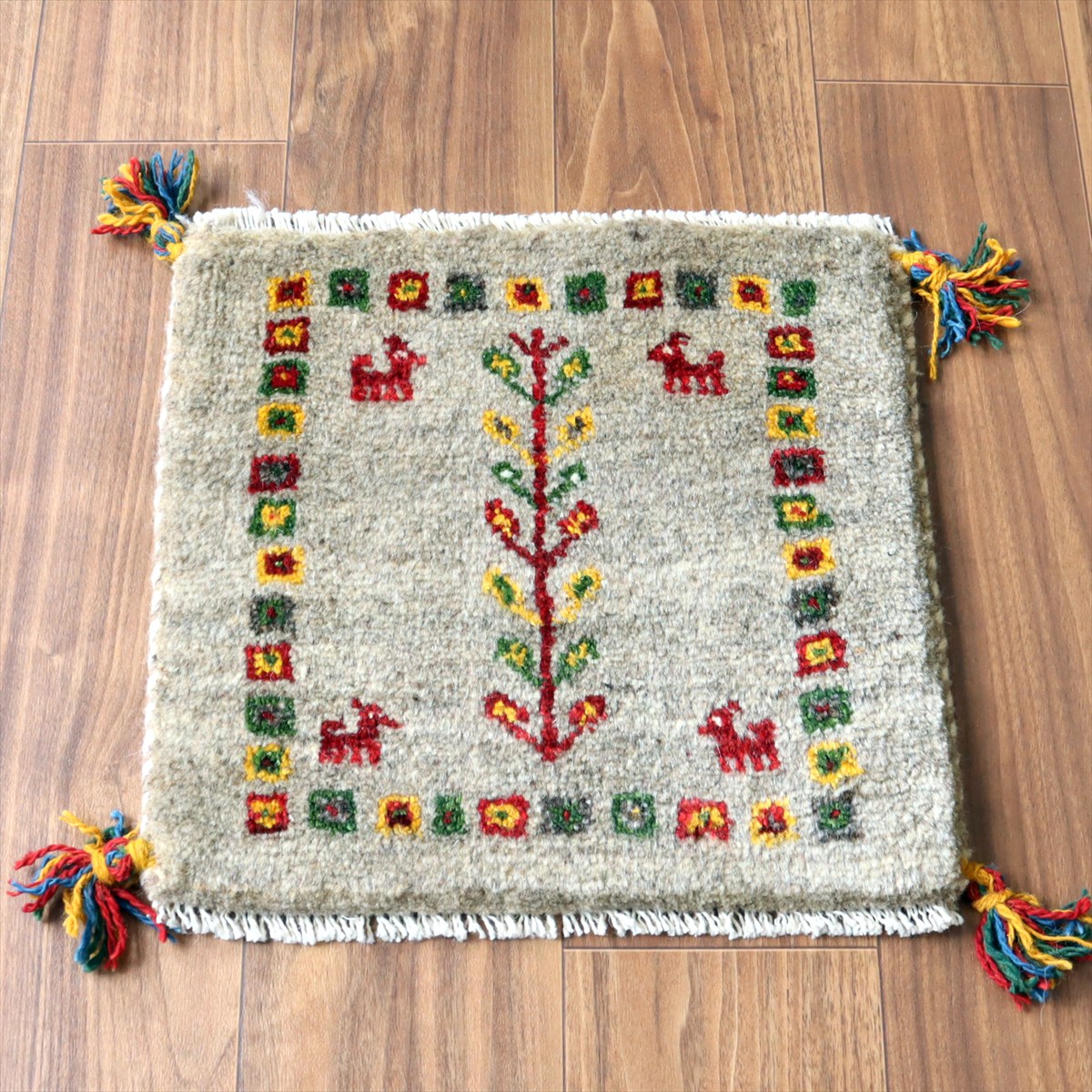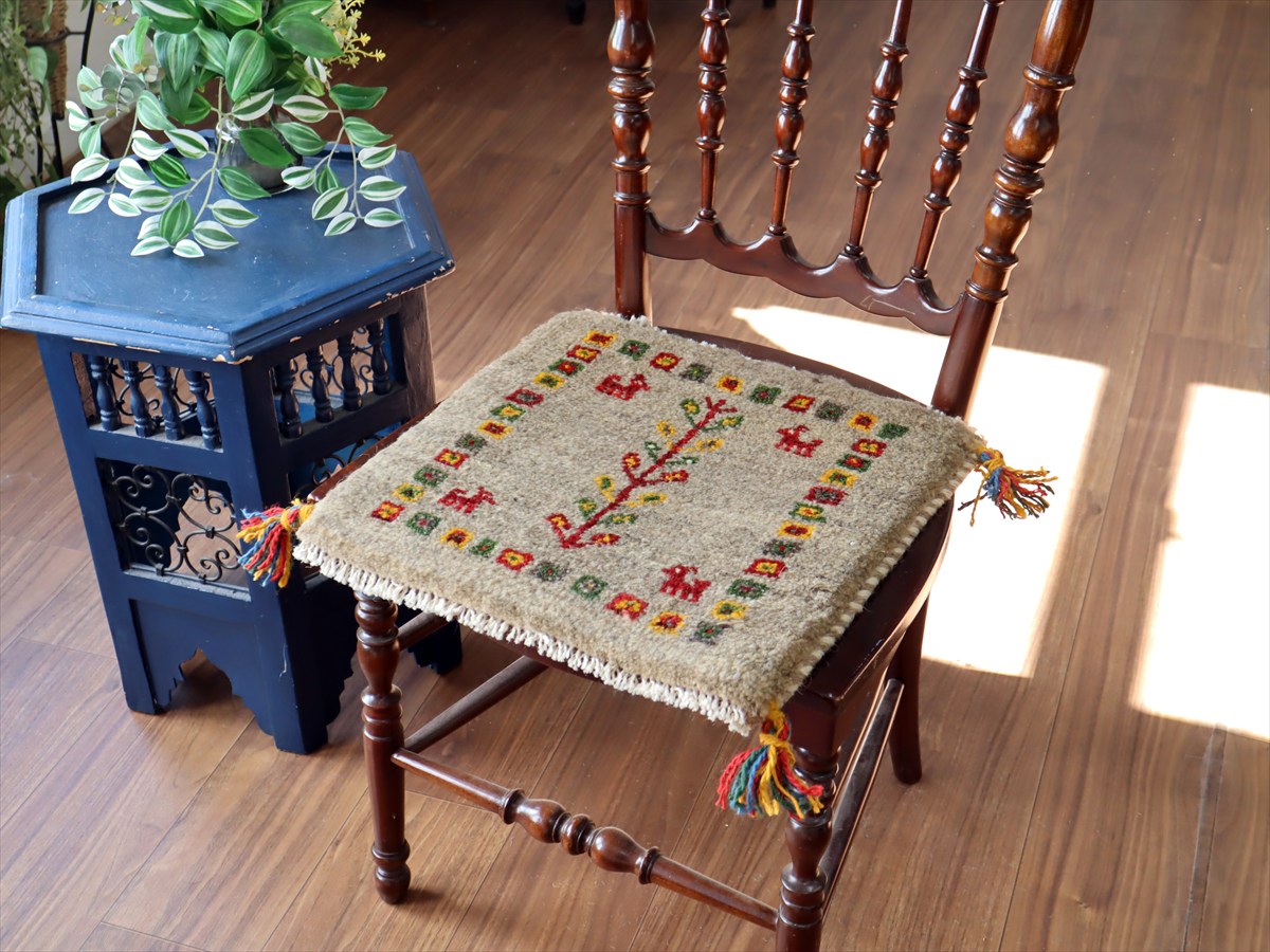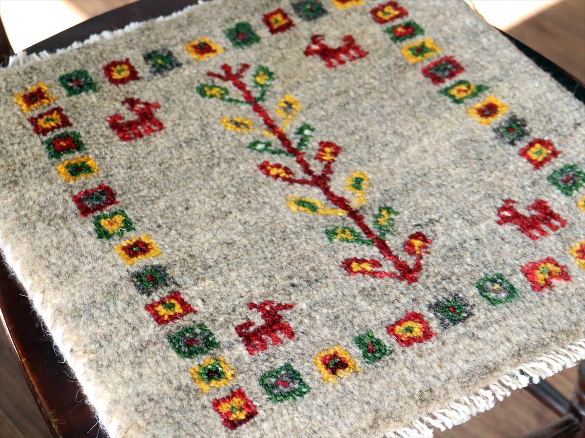 ギャッベ イラン産手織り 座布団サイズ38×41cm ナチュラルアイボリー 生命の樹と動物