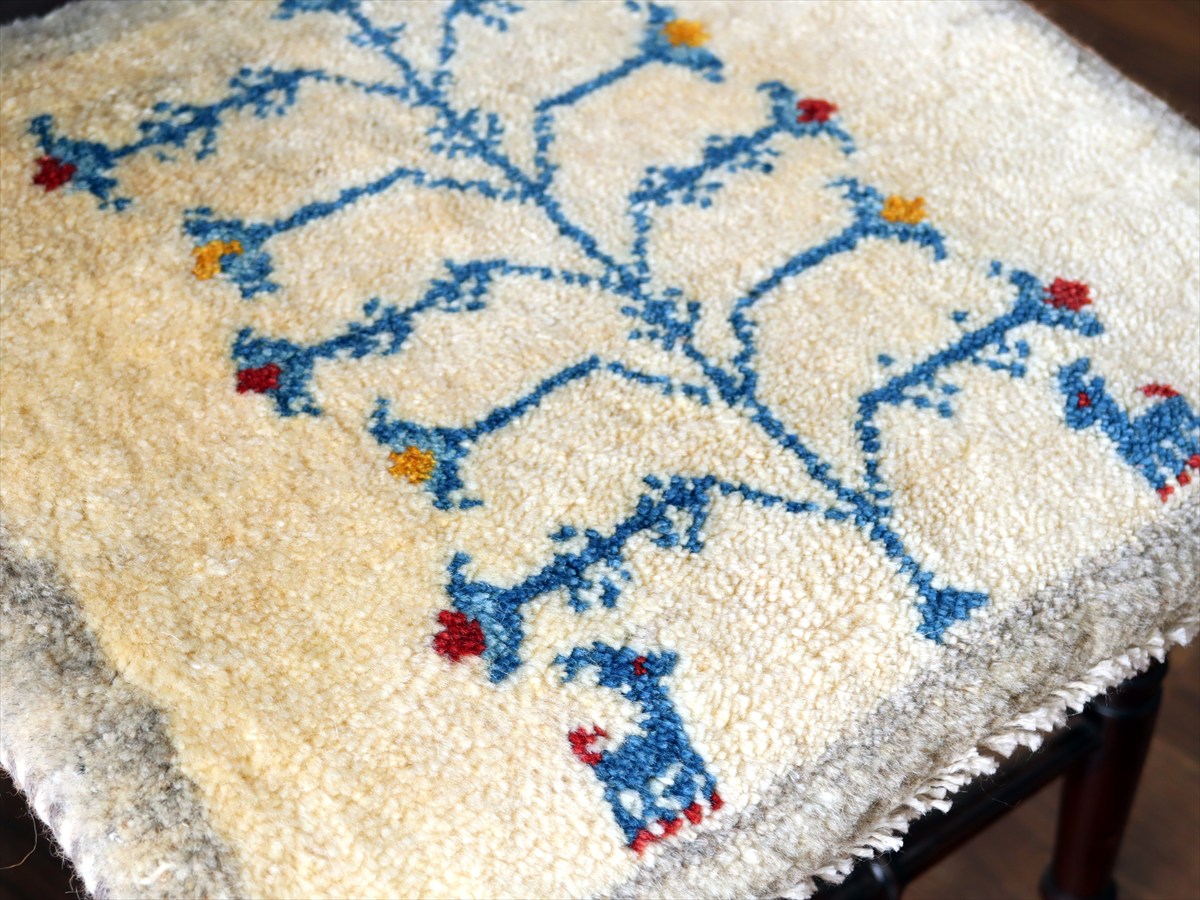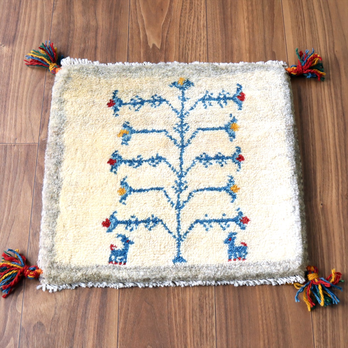 ギャッベ イラン産手織り 座布団サイズ41×44cm ナチュラルアイボリー 生命の樹と動物