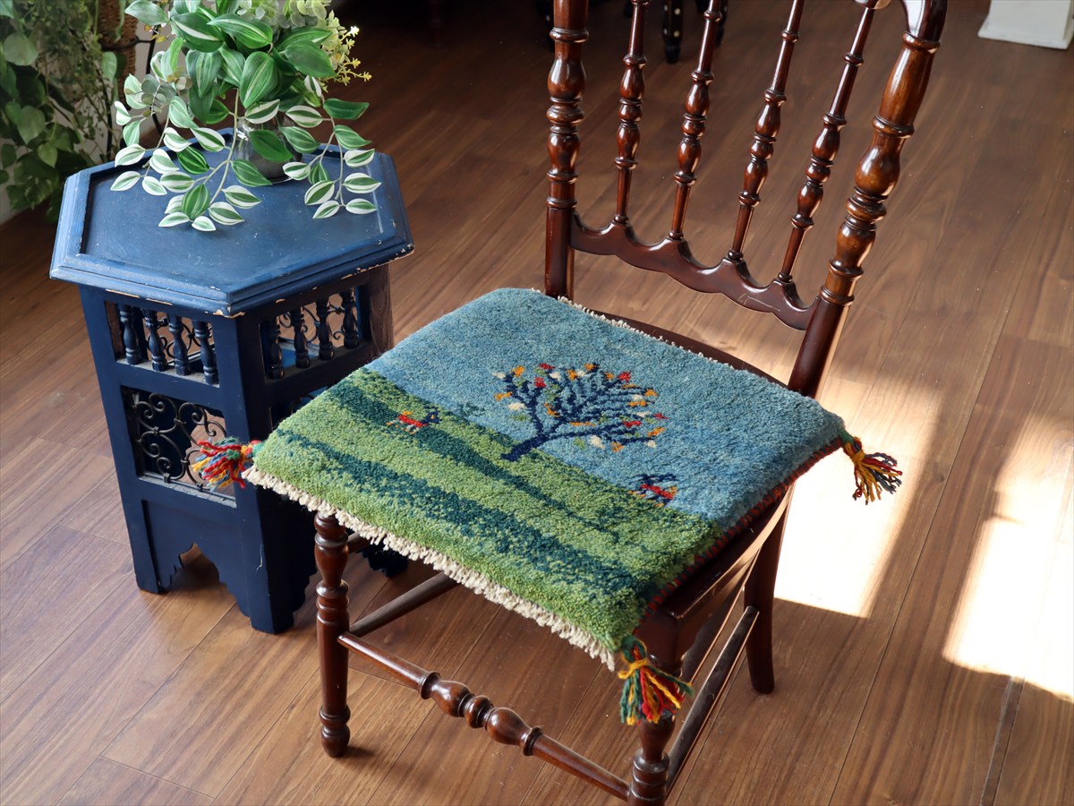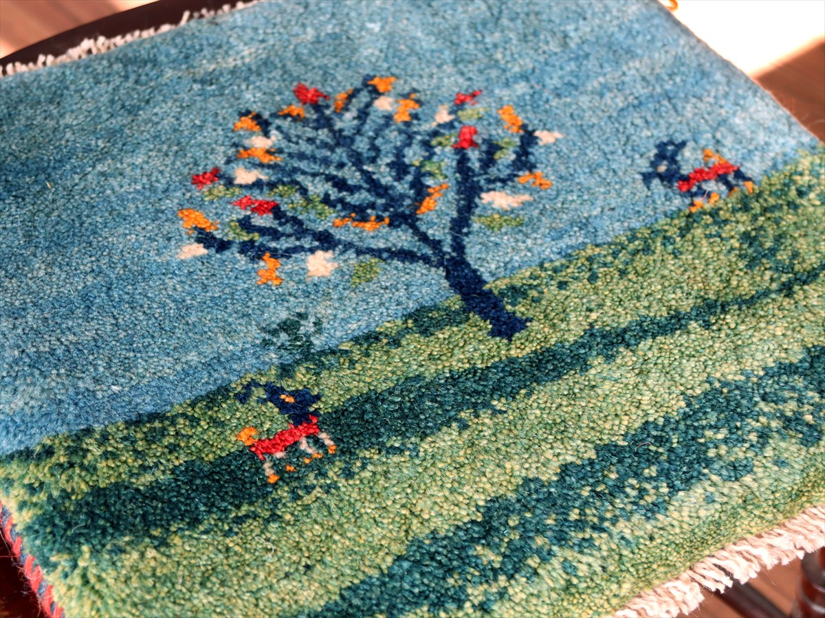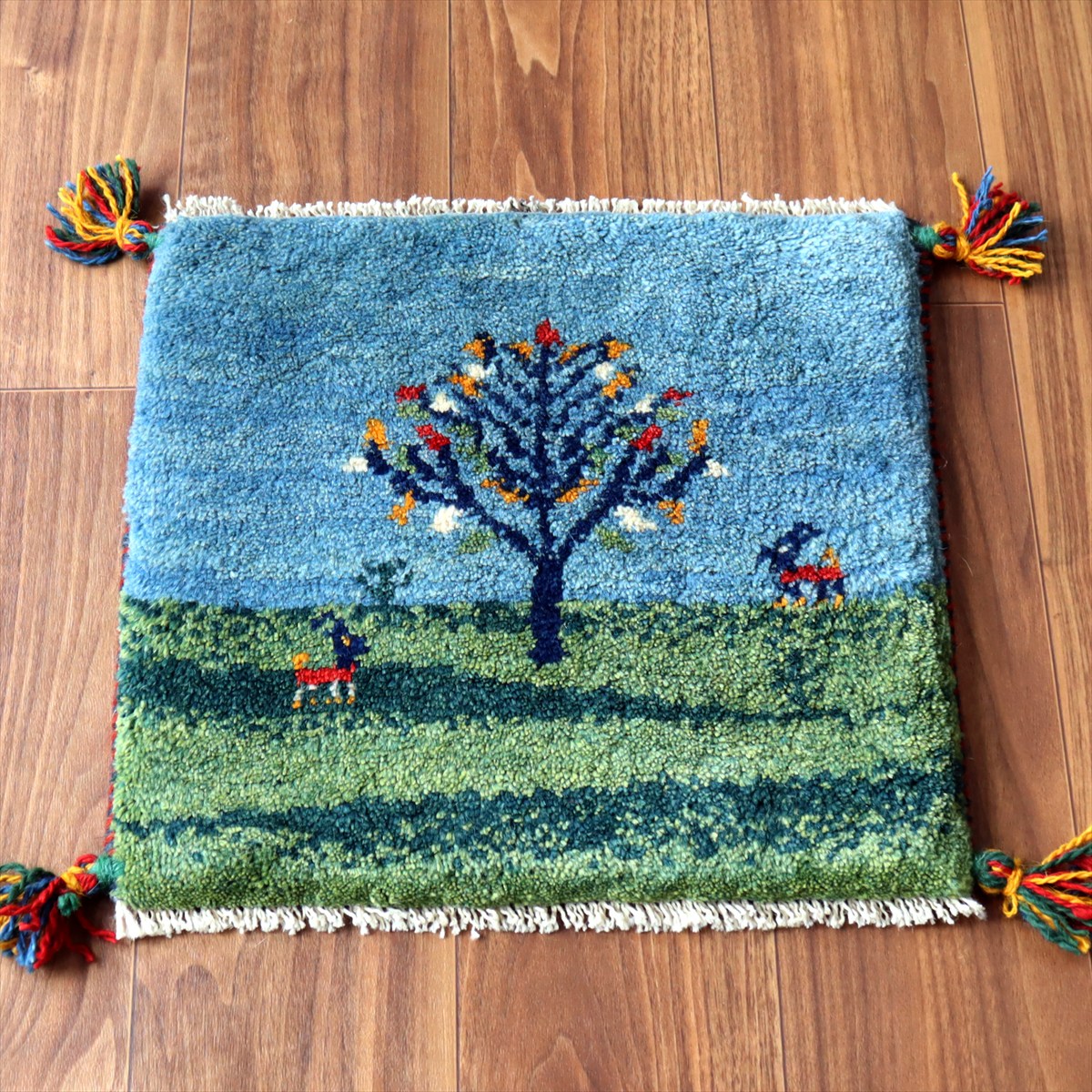 ギャッベ イラン産手織り 座布団サイズ40×42cm ブルー&グリーン ランドスケープ 丘の生命の樹と動物